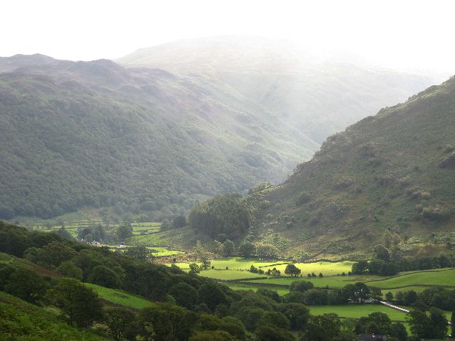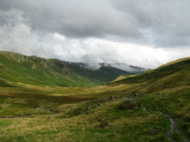 Sooo, this day is best described by: down, up, down, very boggy and wet! All was well on our first descent from Honister to Rosthwaite. The path was clear and mostly dry. At times, the sun even broke through the clouds. In Rosthwaite, however, it started to drizze. Well, that’s what our rain gear is for, it shall be used as well O:) Well protected against the rain and resembling three of the Seven Dwarfs, we set out on our way to Grasmere. We ascent on well trodden paths which turn into dirt tracks which give way to climbing. To get through the pass and into the next dale, we have to tackle this steep mountain face step by step, stone by stone. Our only sign posts are cairns. Thankfully, the rain stops when we get to the climbing part. Once on top, we’re greeted by a muddy path through the bog. It’s a tedious task, trying to navigate the bog, following the cairns and trying to stay relatively dry, or let’s better say: trying to not get soaking wet, all at the same time. This led to some adventurous undertakings on our part: At one point, I thought it wouldn’t be a problem to just jump across a particularly swampy patch to the next dry part. Weeeell… unfortunately, I completely underestimated the increased gravitational forces of a fully packed backpack!! Naturally, this easy jump tanked. Landing way too early and very elegantly on my nose, I got stuck in the mud up to my knee. Gosh, it’s so goddamn rotten to try and free yourself in that position! Now, when you’ve stopped laughing, I’d just like to note that I had dry feet until that moment!!! Bit by bit, we struggled onwards and insisted on putting our feet into various other quagmires – unflinchingly. In the meantime, we played another round of the (not so) funny game of „Search the Next Cairn“. Some of those stupid heaps of stone seemed to be expert players of Hide&Seek. Helped by both map and compass, we made it to a track bringing us down into the valley to Grasmere, where the sun finally showed up again and shone warmly on our backs. At some point on our way, there was a spot with mobile reception. We called each and every one of the B&Bs on our list, but all were already fully booked. We were given another number by one of the owners and got lucky. With a few minutes to 8pm, we reached our B&B weary and with wet feet. Finally: off to a hot shower!