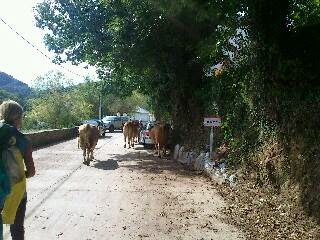 Brr ganz schön frisch oben auf dem Berg 😉 da hilft nur wieder bewegen und weiterlaufen. Was mir etwas entgangen war beim anschauen der Tagesetappe war das es nach O Cebreiro erst noch mal weiter nach oben ging! Egal ich fand den Aufstieg zwar auch anstrengend aber nicht wirklich schlimm und bis Triacastela sollte es zur abwechslung auch ein eher kurzer Tag werden. Nach der Passhöhe von San Roque ging es jetzt abwärts … meistens jedenfalls. Ich weiß gar nicht mehr wo genau wir den Stop für das Mittagessen eingelegt hatten denn wir sind durch so viele kleine Orte gekommen, das ich irgendwann keinen überblick mehr hatte. Direkt vor Triacastela sind wir in eine kleine Kuhherde reingeraten die auf dem Weg in den Stall war. Das war schon lustig, die haben sich null aus der Ruhe bringen lassen von den ganzen Pilgern die neben und zwischen der Herde mitgelaufen sind. Nach erfolgreicher Zimmersuche setzte ich mich noch mit den anderen auf ein Bier zusammen ehe sie weiterzogen, um sich auf ihre NachtWanderung vorzubereiten. Nach einer schnellen Tour durch einen Supermarkt war ich gerade auf dem Weg unter die Dusche als Neele mir schrieb das sie kurz vor Triacastela ist, Juhuuuu! Ich packte nur meine Wertsachen und fragte an der Rezeption wo die Bushaltestellen im Ort sind und war kaum auf der Straße als sie schon nach mir rief.