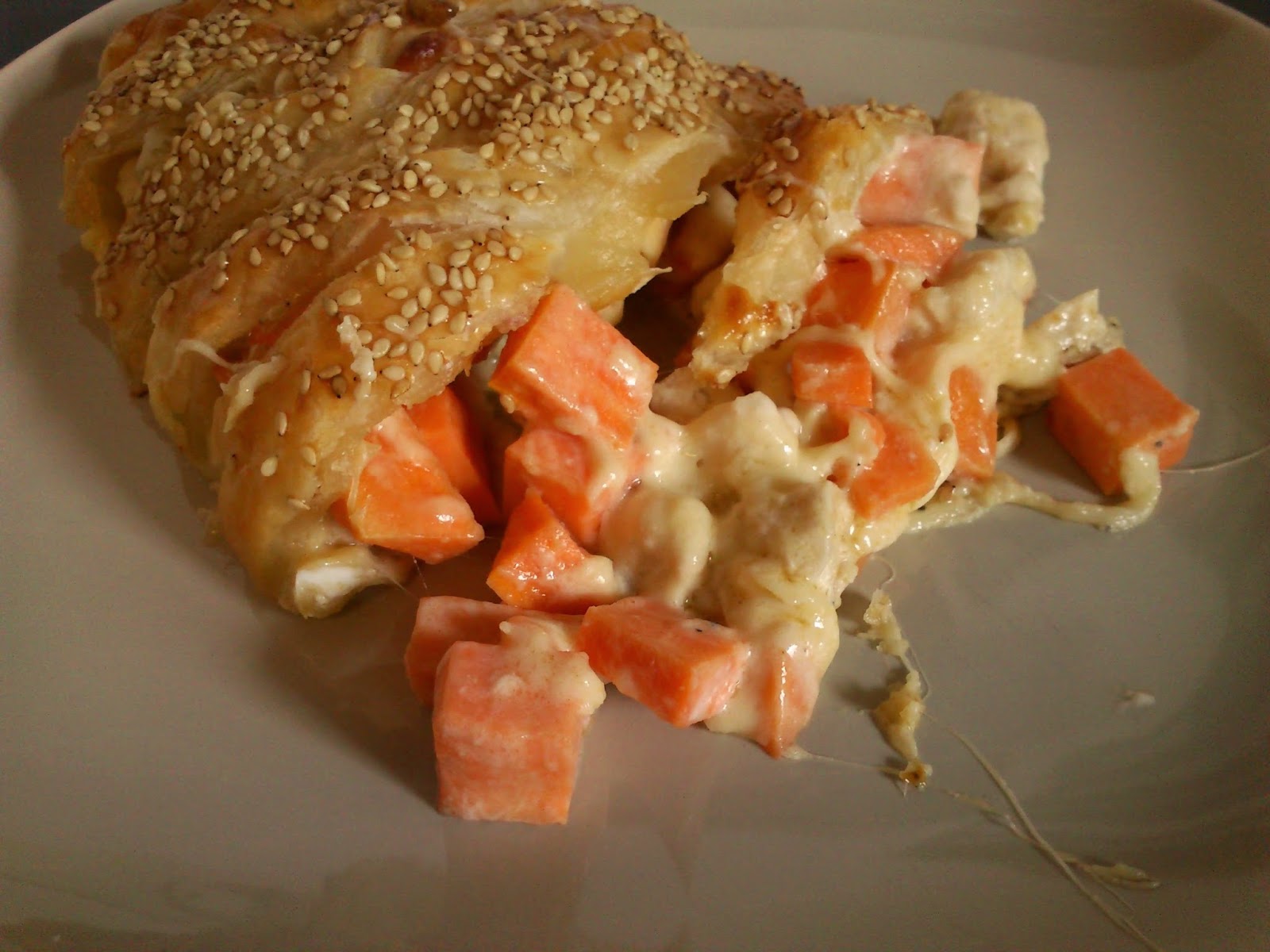 Die Süßkartoffel auch in kleine Würfel schneiden und zusammen mit ein zwei Eßlöffel Bruch und geriebenem Käse zu dem Fleisch geben. Gut mischen und dann auf dem Blätterteig,der vorher mit eine Ei eingepinselt wurde, verteilen. Die längseiten vom Blätterteig wie auf dem Foto einschneiden und dann über der Füllung verschränken. Das ganze noch mal mit Ei einpinseln und dann ab in den Backofen damit.
