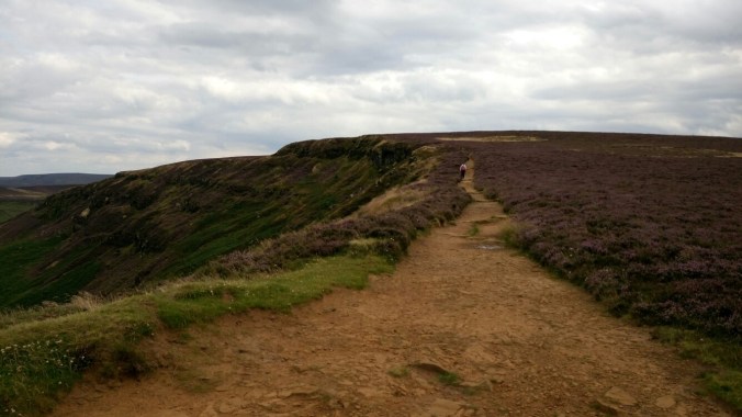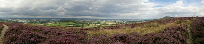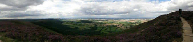 Ab jetzt ist es theoretisch nur noch dem gut sichtbarem Weg folgen und die Aussicht genießen. Von oben schaut das Vale of Mowbray sogar richtig hübsch aus wie ein weicher Flickenteppich. Die Sicht ist heute so gut das wir schon die Küste am Horizont sehen können und die Schiffe die dort lang fahren. Wow, jetzt geht es wirklich auf das Ende zu! Die auf und Abstiege sind auf der heutigen Etappe ordentlich Steil. Da wir genug Zeit hatten machten wir einfach auf fast jedem Gipfel eine Pause, um die Sonne und die Aussicht zu genießen und die war auch einfach superschön!