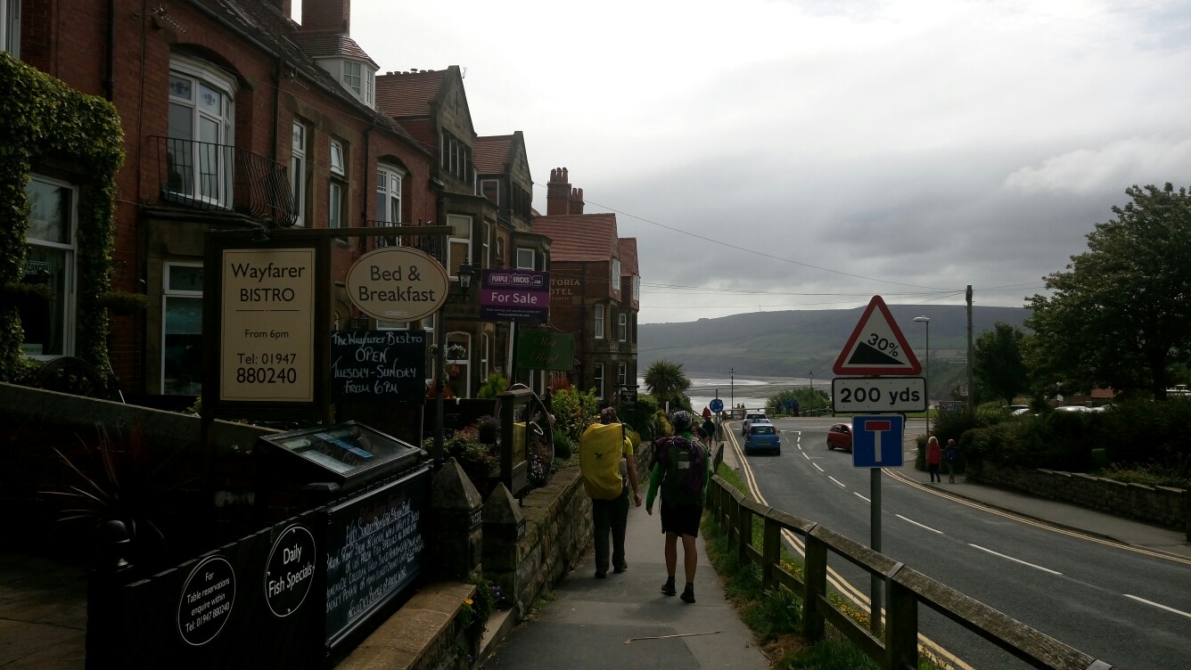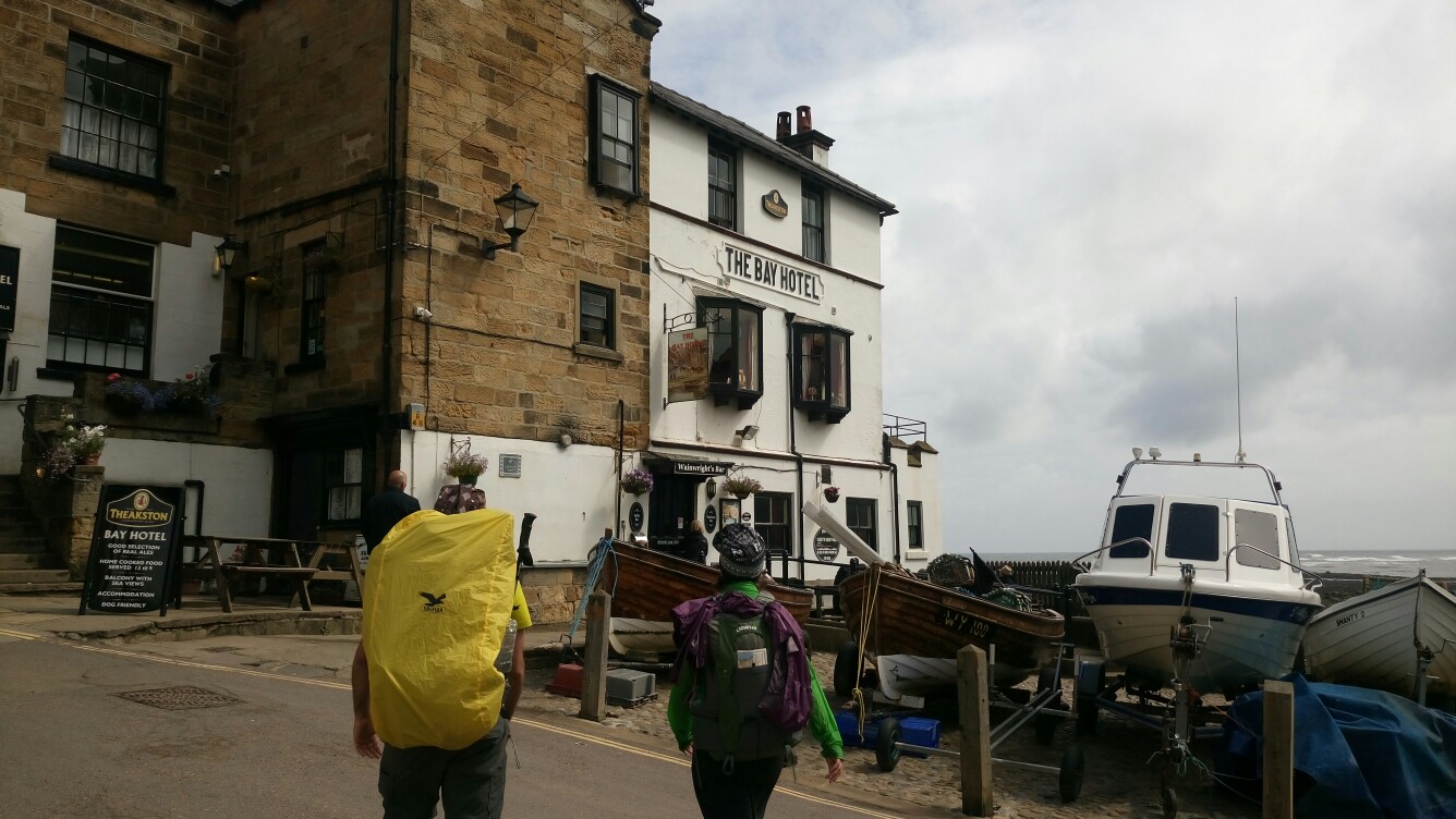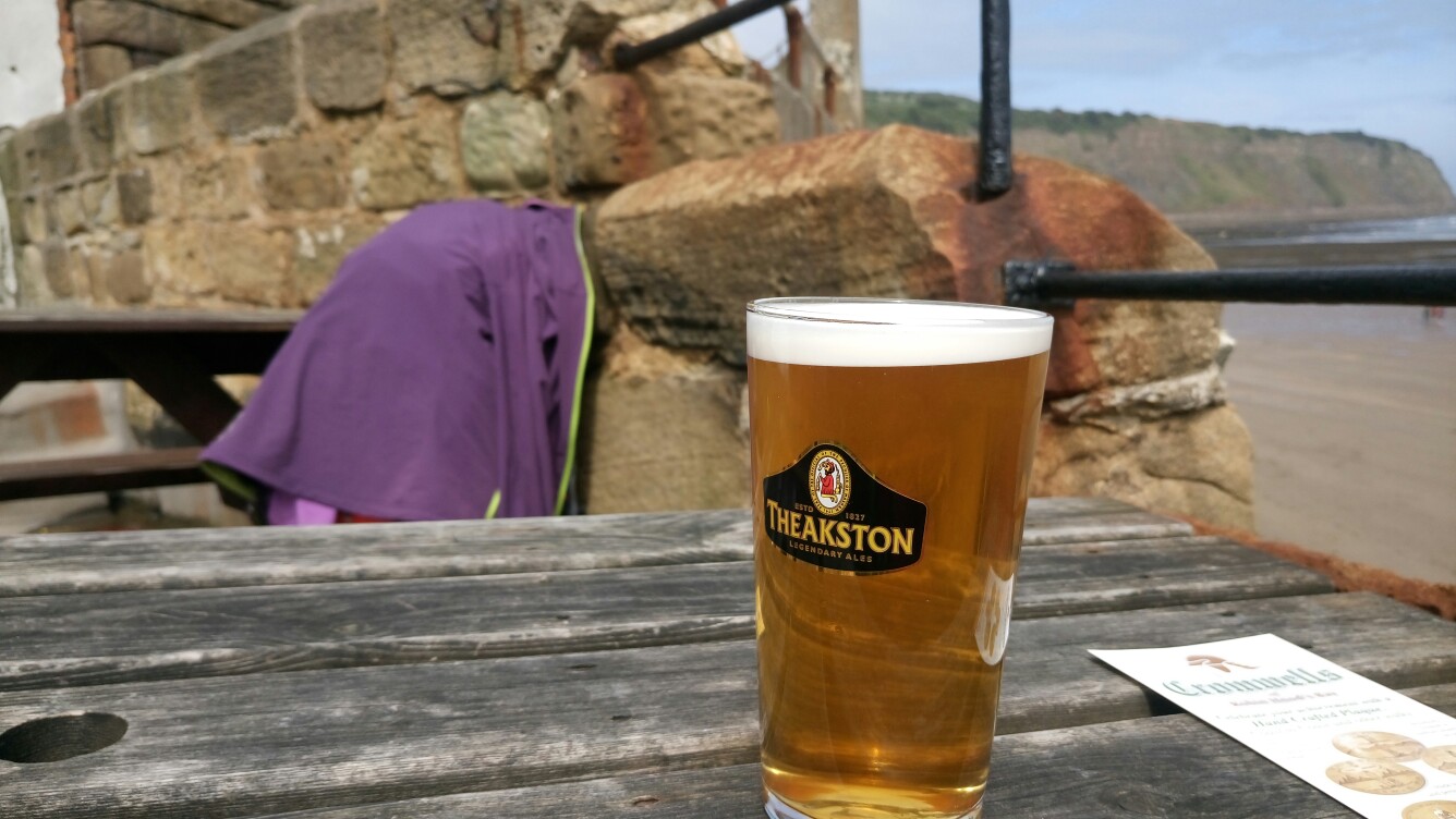 In der Nacht hörte es sich noch nicht danach an als ob der Regen noch mal aufhören würde aber tatsächlich pünktlich zum aufstehen war es von oben trocken. Um wirklich den Coast to Coast korrekt zu beenden sind Franzi, Snir und ich zurück nach Hawsker wo wir den Tag vorher gestoppt hatten. Ein kurzes Stück noch und wir waren endlich an der Küste und die Sonne kam raus! Jetzt folgten wir nur noch dem Fußweg nach Robin Hoods Bay und ließen uns richtig Zeit um die letzten paar Kilometer zu genießen. In Robin Hoods Bay angekommen sind wir als erstes in die Wainwright Bar im Bay Hotel. Das Essen dort ist absolut zu empfehlen. Ich weiß gar nicht was so viele mit dem englischen Essen haben. Ich hatte bisher nichts in den diversen Pubs gehabt was nicht geschmeckt hat.