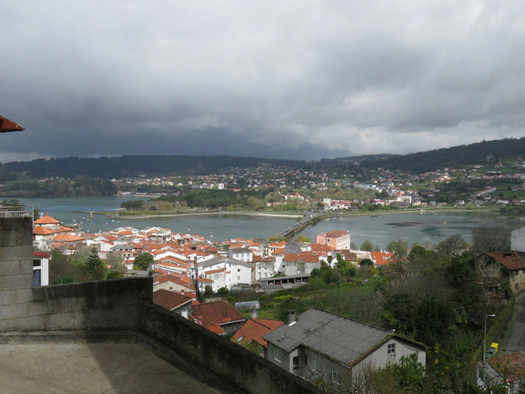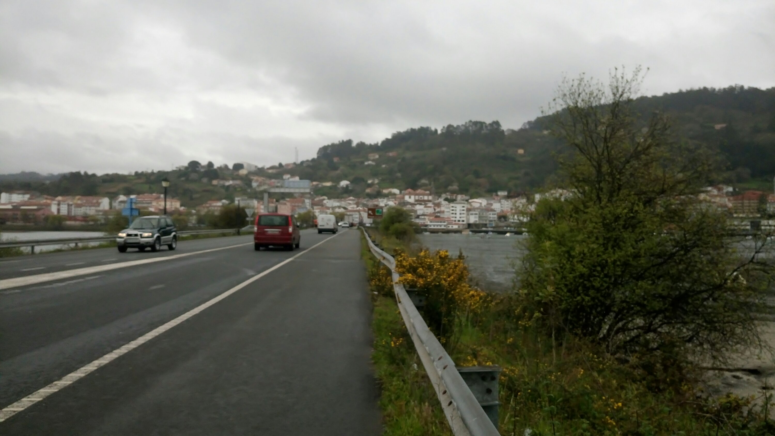 Nach diesem Abenteuer ging es nur noch Bergab bis Pontedeum. Kurz vor der Brücke fing es leicht an zu Regnen machte aber nichts ich wollte hier eine längere Mittagspause machen und suchte eine Bar wo es was zu Essen gab. Lecker, lecker! Nach dem Essen schaute ich kurz in meinen Reiseführer und las mit erschrecken, das die ersten eineinhalb Kilometer auf der Etappe die steilsten des Tages sind. Super, ich probiere dann mit dem vollen Bauch mal aus, locker den Berg hochzurollen! Schnaufend oben angekommen, ja ich kann das auch, war die Aussicht auf das Tal einfach nur schön. Der Rest des Weges bis Miño lief fast konstant nur noch abwärts durch Wälder und kleine Ortschaften.