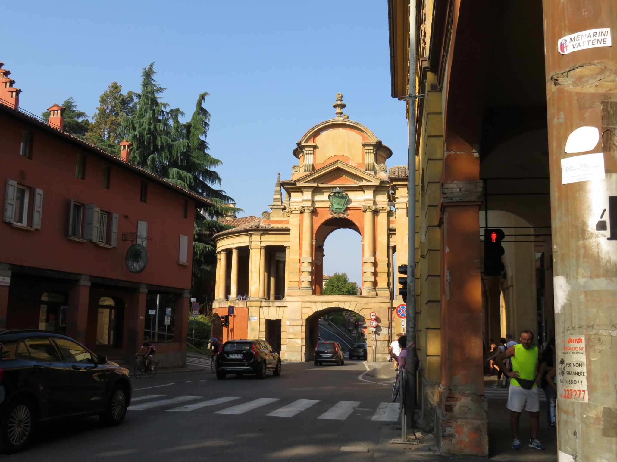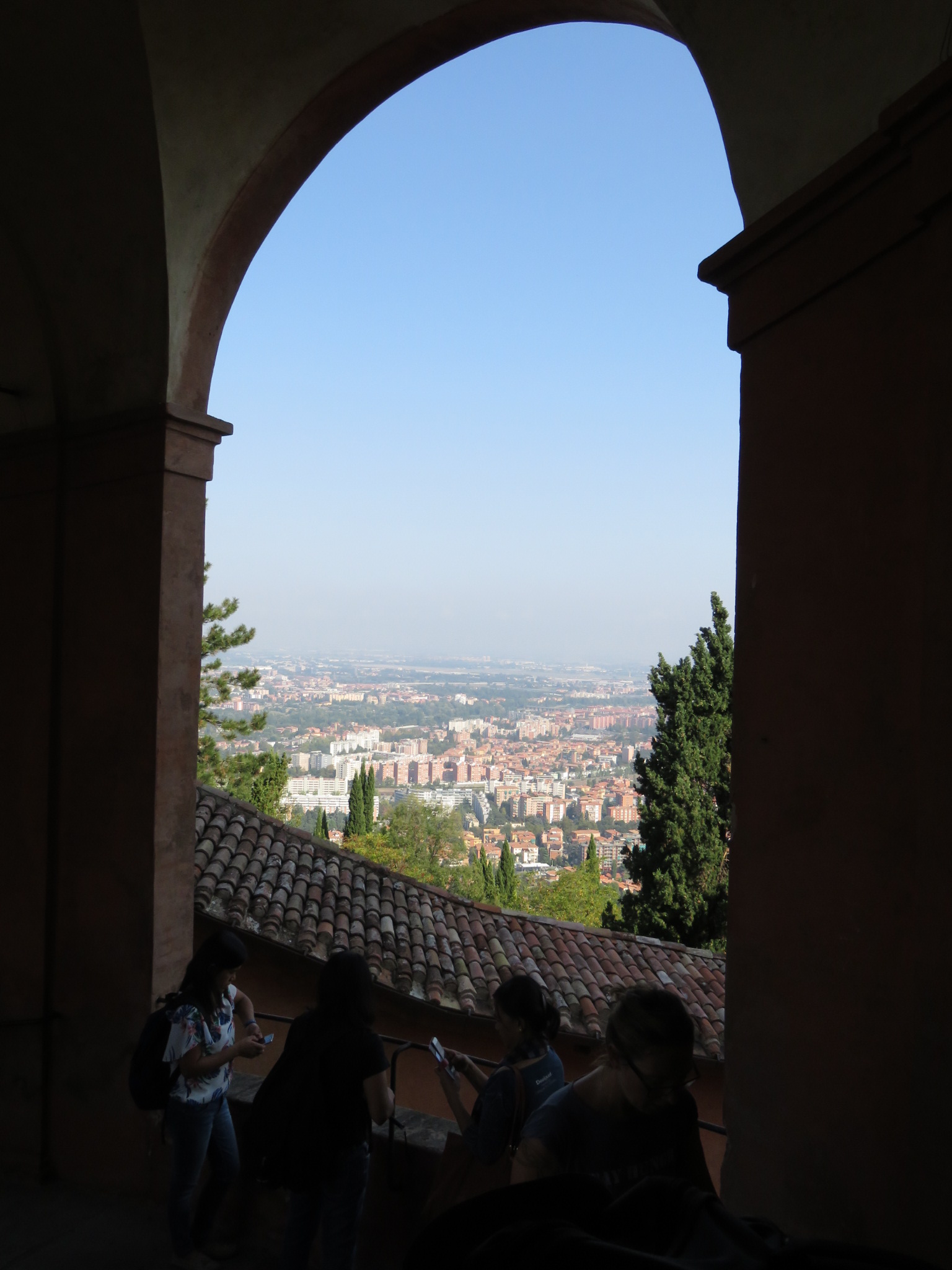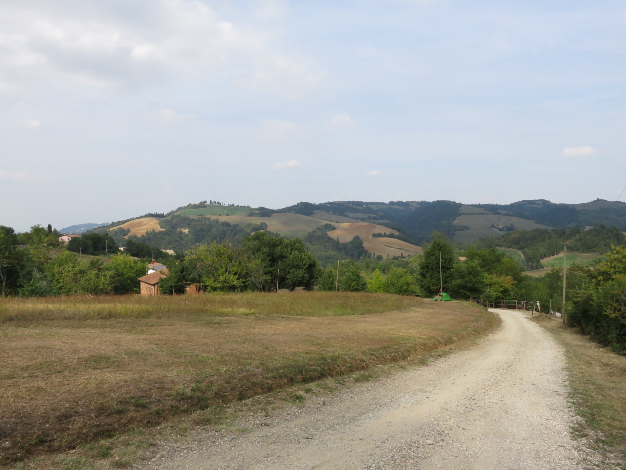 Nachdem die Rucksäcke gepackt waren machten wir uns auf den Weg in die Altstadt. Zum einen wollten wir noch frühstücken und zum „Startpunkt“ der Via Degli Dei am Piazza Maggiore. Da es keinen wirklichen Startpunkt dort gibt machten wir fix ein Foto mitten auf dem Platz und hatten gleich Kontakt mit den ersten Wanderern. Wie wir wollten sie den Götterweg gehen. Nach ein paar Engen Straßen ging es weiter durch endlos scheinende Arkadengäge Richtung Stadtgrenze. Definitiv schattiger wie an der Straße langzugehen. An der Porta die Saragozza angekommen fing der Portico die San Luca an. Wieder ein Arkadengang mit angeblich 666 Bögen und ca. 3,7 km lang. Ganz zu schweigen von der Steigung die rauf zu Basilika San Luca schon ordentlich war. Die Aussicht war toll und wir haben unseren ersten offiziellen Wegweiser entdeckt. Juhuu! Von hier geht es auf schmalen Pfaden wieder Bergab und dann weiter durch einen Park der fast übergangslos uns zum Fluss Reno führte. Dem folgten wir sehr lange auf meistens schmalen Pfaden die sich durch den Wald schlängelten. Nach einer kurzen Pause am ausgetrockneten Flussbett ging es zügig weiter bis wir irgendwann an einer Straße rauskamen. Der müssten wir nun erstmal Folgen. In einer Kurve hatten wir einen tollen Ausblick über das Tal und einen Fluss. Als wir stoppten um zu fotografieren kam eine ältere Frau auf uns zu und fragte ob wir was trinken und essen wollen. Ein kaltes Wasser nahmen wir gerne und sie fragte uns ob wir die Via Degli Dei gehen wir bejahen und alles weitere hatte ich dann nicht mehr verstanden. Das war zu schnell 😉 Ein junger Mann kam dazu und half übersetzen und schnell war klar es ging darum.wie weit wir gehen wollen und wo wir übernachten wollen. Das Angebot bei unserer angestrebten Unterkunft anzurufen nahmen wir gerne an und es stellte sich raus sie ist geschlossen. Verdammt aber gut das vorher zu wissen so fingen wir an umzuplanen. Mit der Einteilung war das jetzt gar nicht mehr so einfach. Am Abzweig nach Sasso Marconi machten wir dann für heute Schluss und bauten unser Zelt auf einer Wiese hinter einem B&B auf. Quasi erlaubtes Wildcampen, denn außer dem Platz zum zelten haben wir nichts weiter müssen aber auch nichts bezahlen 🙂 Eine Wahnsinns Aussicht kommt noch daz und vielleicht haben wir Glück und sehen die Sterne heute Nacht über uns.