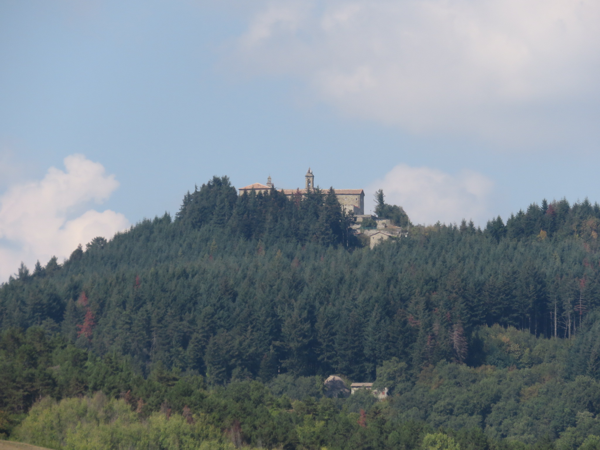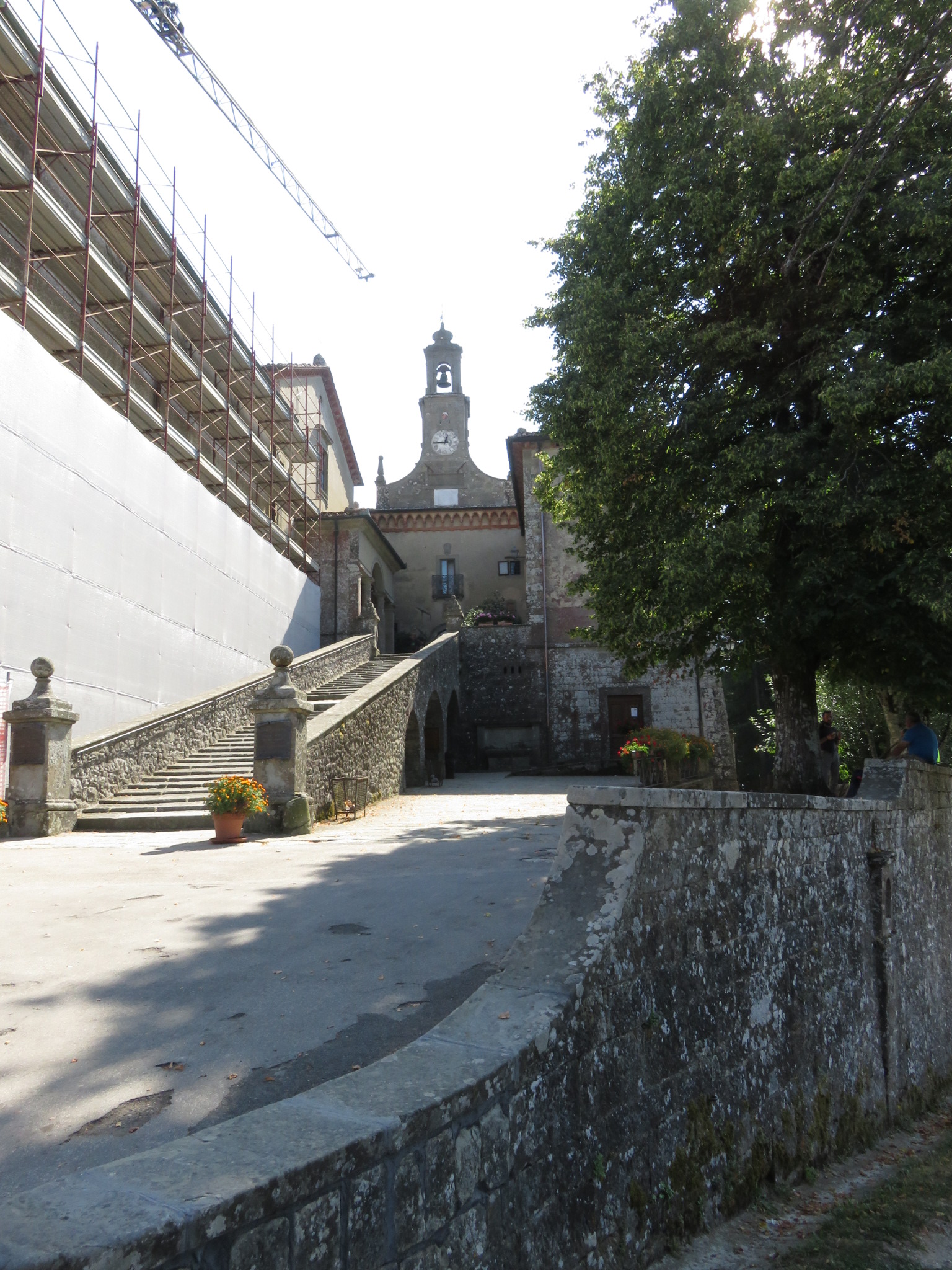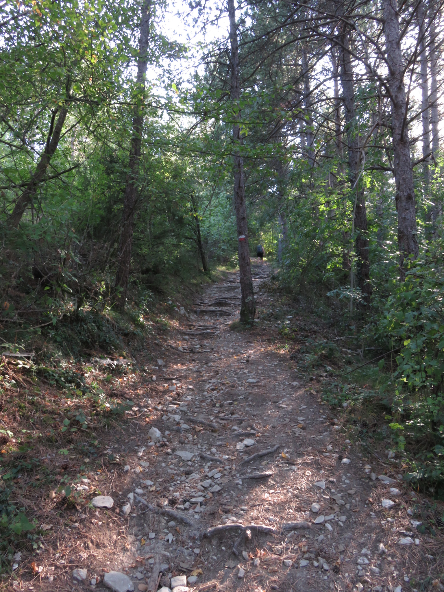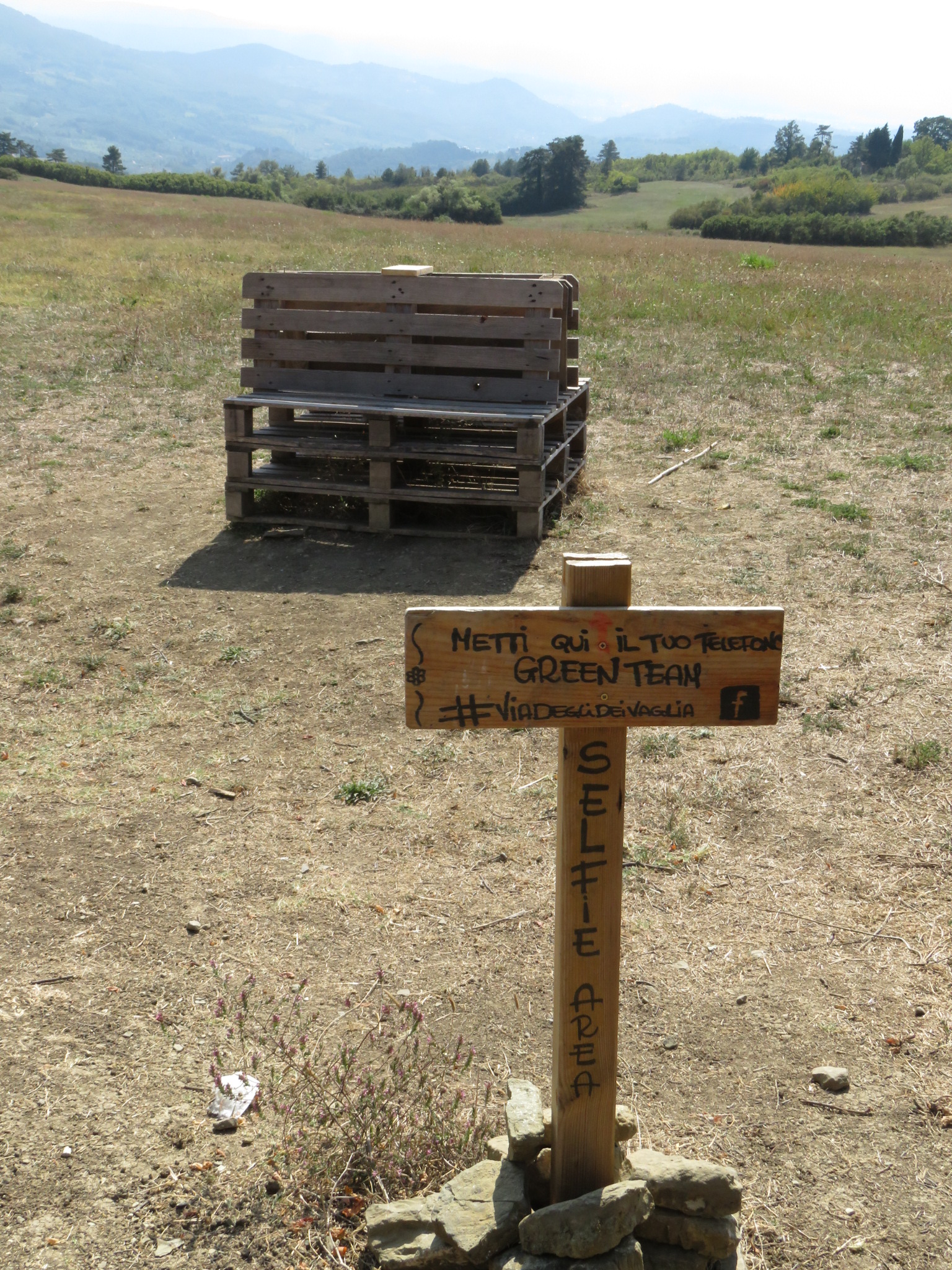 Nach einem noch recht sanften Anstieg zu Beginn ging es über unterschiedliche Wege bis Tagliaferro. Dann begann der Spaß! Himmel hilf, über 7 km zog sich der stellenweise echt steile Aufstieg vorbei an der Klosterruine Badia Buonsollazzo bis hoch zum Monte Senario. Das hatte zwischendurch schon wieder den Charakter von einem leichten Klettersteig. Wir hielten uns tapfer und die Aussicht auf ein nettes Café am Monte Senario gab uns den entsprechenden antrieb den höchsten Punkt des Tages zu erreichen. Oben angekommen war die Aussicht fantastisch aber das Café leider geschlossen! Brummmelnd füllten wir unser Wasserflaschen am Brunnen auf und beim umschauen stellten wir fest hier sieht es insgesamt geschlossen aus. Wahrscheinlich wegen den Bauarbeiten, denn deshalb Kloster war eingetütet. Immer mehr Wanderer erreichten die Spitze und waren wie wir ziemlich enttäuscht das es hier nicht wie in diversen Reiseführer versprochen etwas zu essen gab. Ein weiterer Blick in die Karte zeigte das es eventuell etwas in Vetta le Croci geben könnte. Die Rucksäcke also wieder aufsetzen und los geht’s. Siehe da vier Kilometer später könnten wir uns in der ggeöffneten Bar unser verspätetes Mittagessen holen, mjam das wurde nun auch höchste Zeit. Seit dem Abstieg von Monte Senario kreuzt die Via Degli Dei immer wieder einen anderen Wanderwege den