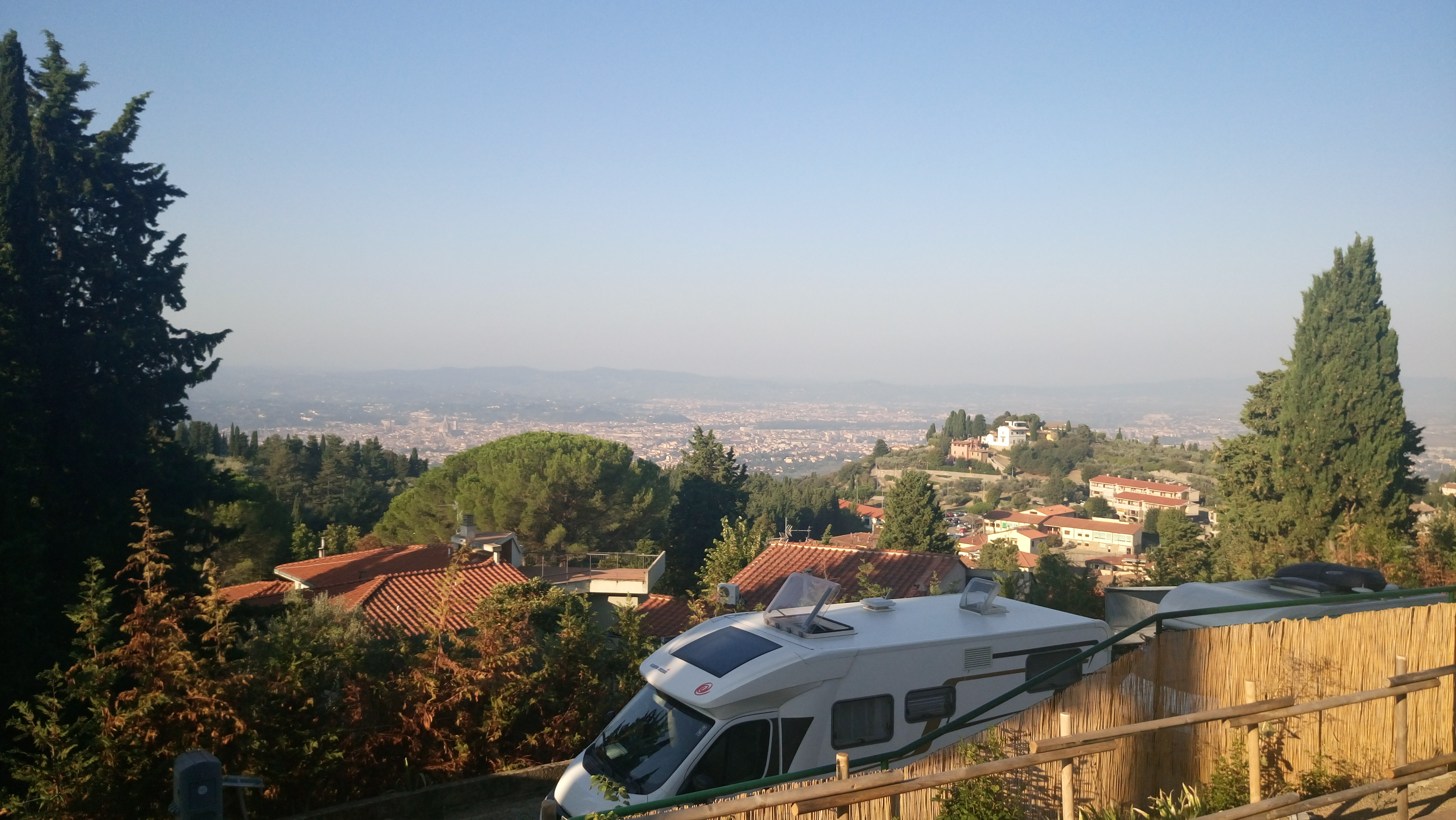 Heute morgen beim Frühstück hatten Franzi und ich beschlossen wir laufen erst einmal bis Fiesole und schauen dann, wie spät es ist und ob wir noch fit genug sind um bis zum Stadtrand von Florenz weitet zu laufen. Eigentlich endet der Weg in der Altstadt von Florenz am Piazza Dei Signoria. Unser Buch empfiehlt nur bis Fiesole zu laufen und den Rest mit dem Bus zu fahren. Das war auch mein Gedanke denn ab Fiesole geht es hauptsächlich an der Straße entlang die zum Teil auch rege befahren sind. Da ich dieses Stück in die Stadt mehrfach schon gelaufen war meine Entscheidung recht einfach gefallen: können wir uns sparen. Franzi war der gleichen Meinung und so sagten wir uns erstmal bis dahin und dann schauen wir weiter. Netterweise durften wir den Campingplatz auch wieder durch die Hintertür verlassen. So waren wir direkt wieder auf der Via Degli Dei und mussten keinen großen Umweg machen.