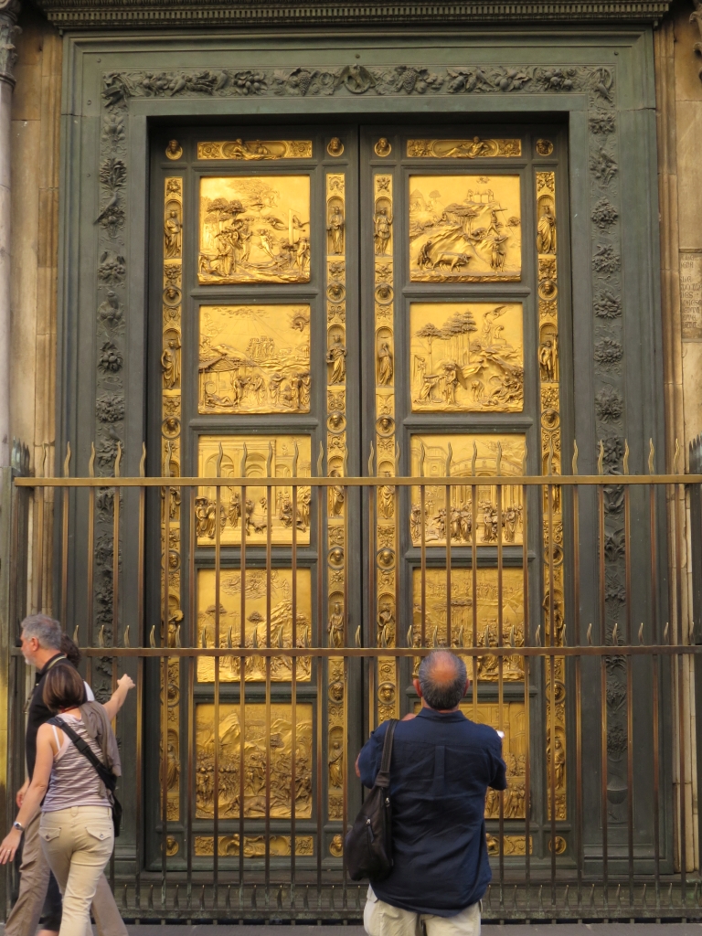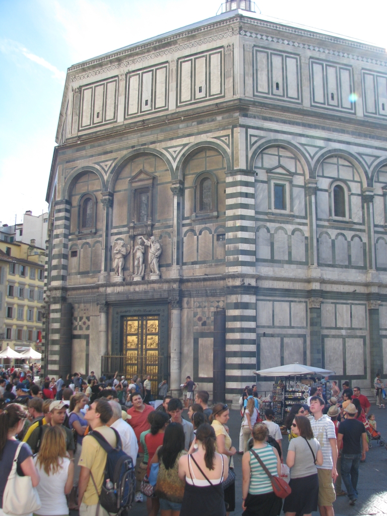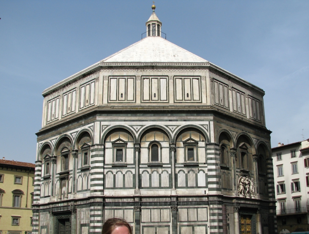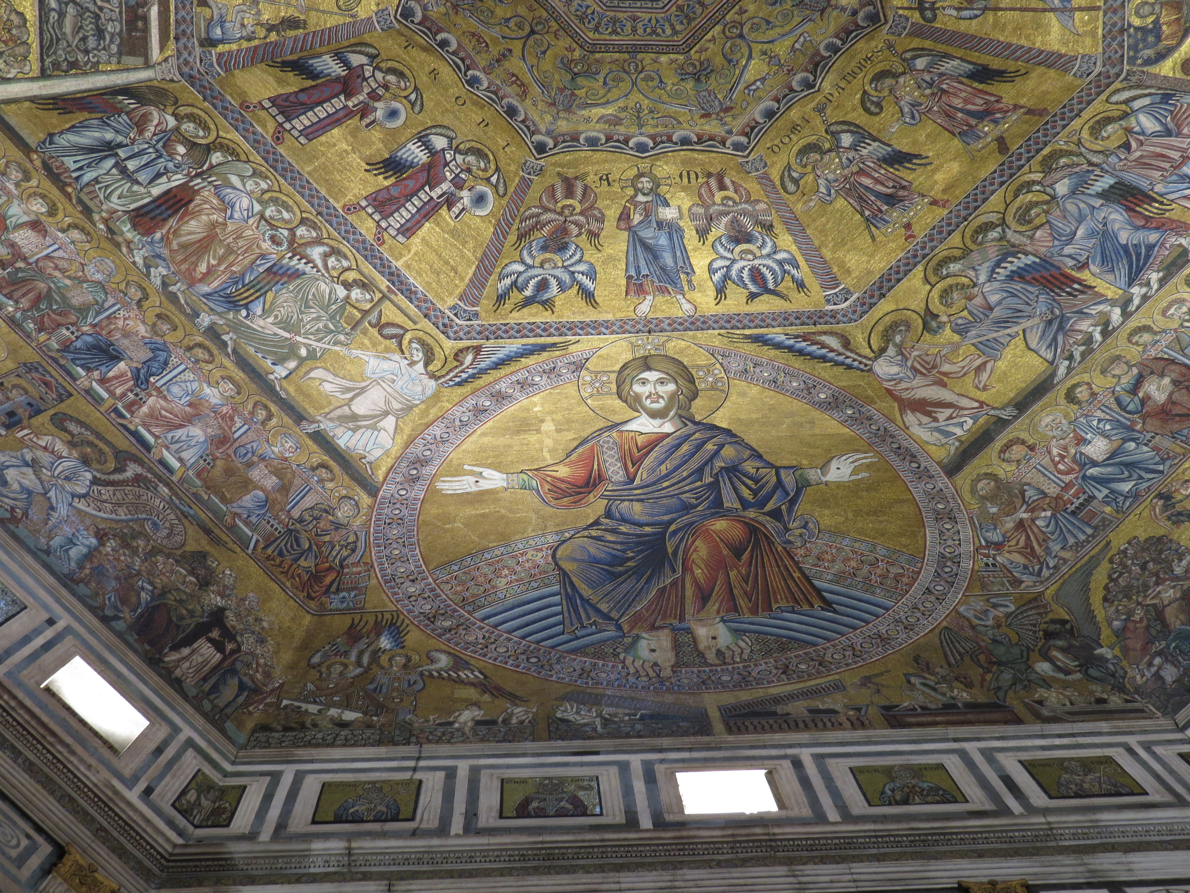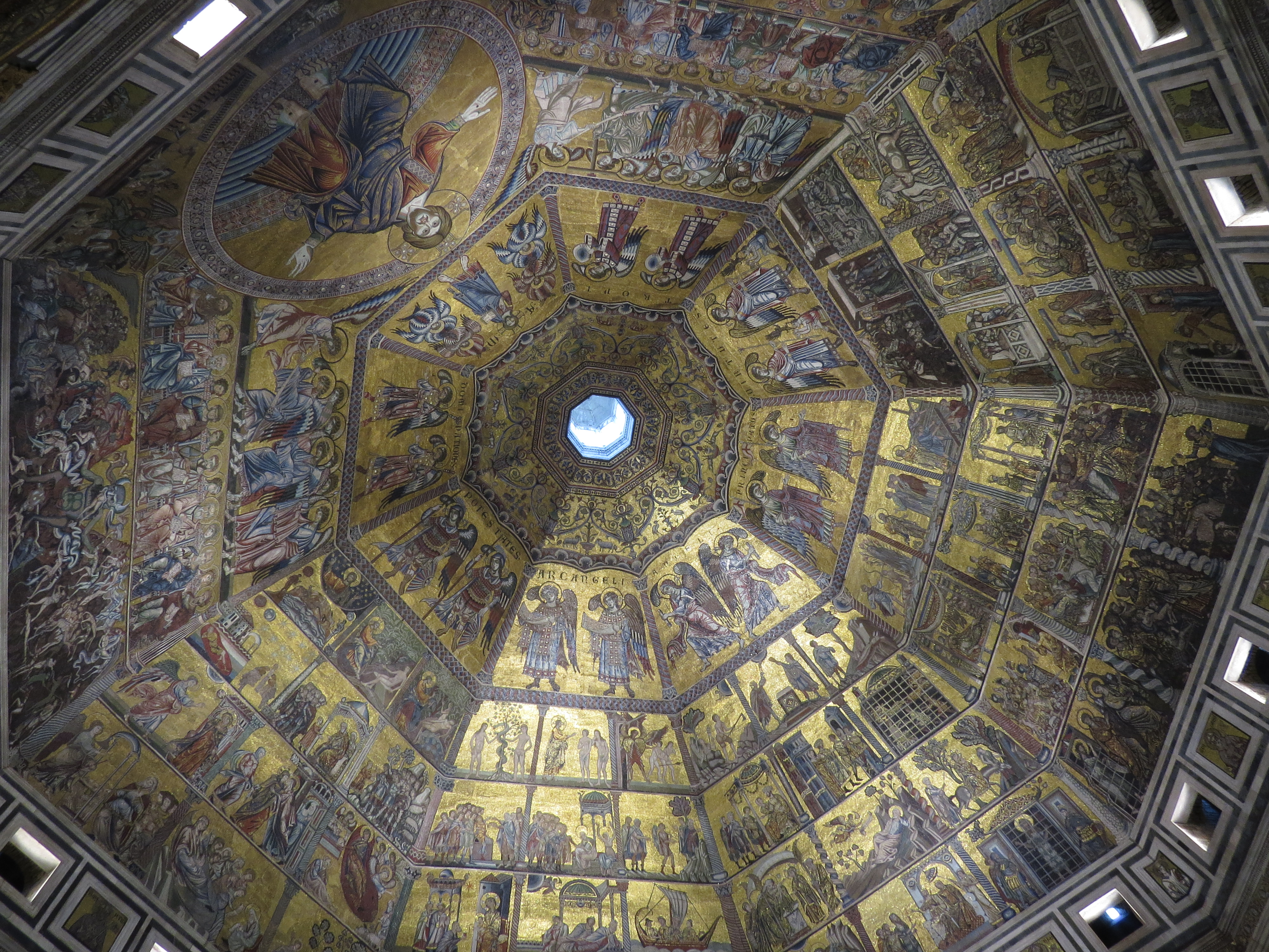 das Baptisterium San Giovanni ist die Taufkirche des Doms von Florenz und steht gegenüber dem Dom. Die drei künstlerisch bedeutsamen Bronzeportale der Kirche von Lorenzo Ghiberti und Andrea Pisano entstanden zwischen 1330 und 1452. Der Innenraum des Battistero liegt etwas tiefer als die Straße, daher steigt man zuerst einige Stufen hinab und betritt einen mit Mosaiken ausgekleideten Fußboden, der Blick nach oben lässt einen dann nur noch staunen. Die Kuppel ist ausgekleidet mit unzähligen goldfarbenen Mosaiken die verschiedene biblische Geschichten erzählen.