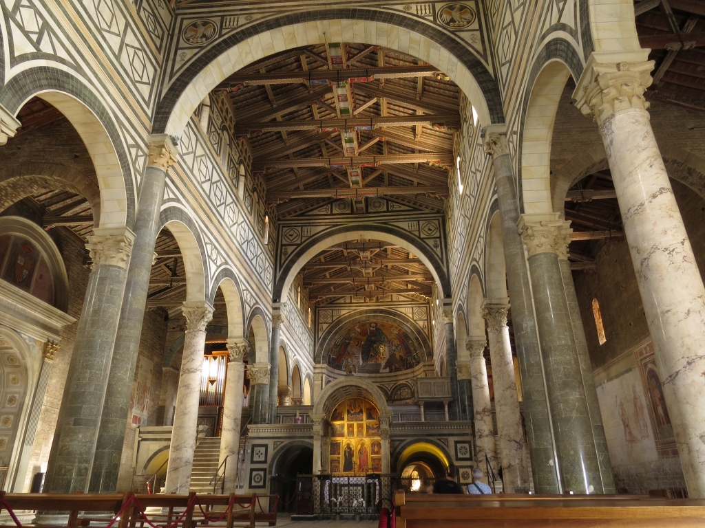 Die Basilika San Miniato al Monte steht auf einem der höchsten Punkte der Stadt. Sie ist ein typisches Beispiel der romanischen Architektur der Toskana und gilt als eine der schönsten Kirchen in Italien. Für mich auf jeden Fall eine der schönsten in Florenz. Die Fassade ist mit weißem Carrara-Marmor und dunkelgrünem Serpentin aus Prato verkleidet. Diesen Stil werden wir noch an weiteren Kirchen in der Stadt sehen.