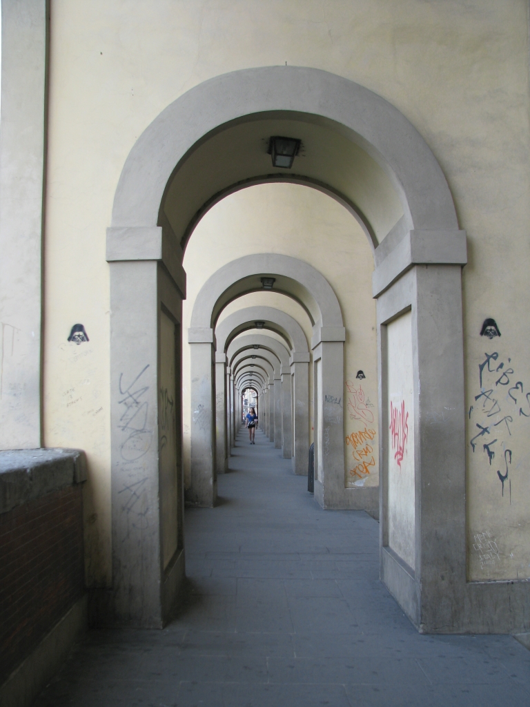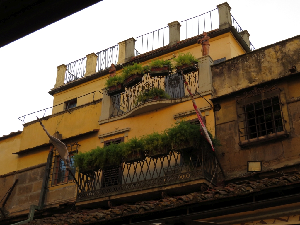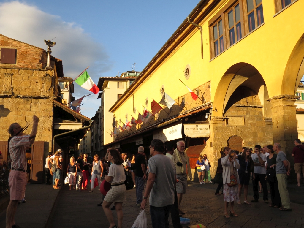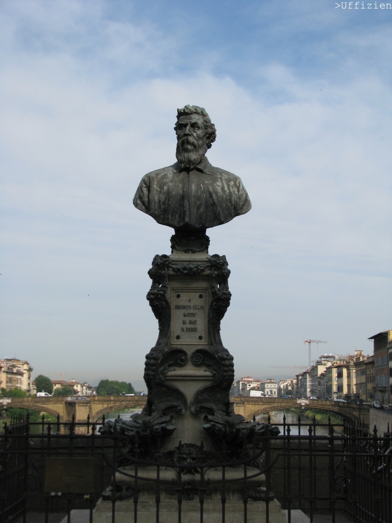Ursprünglich waren auf der Brücke hauptsächlich Schlachter und Gerber ansässig. Die Schlachter warfen ihre stinkenden Abfälle in den Arno und die Gerber wuschen ihre Stoffe aus. Unter Cosimo dem I. wurde dies jedoch per Dekret verboten und durch Goldschmiede ersetzt, da diese keinen Abfall produzieren. Heute befinden sich zahlreiche Juweliere in den kleinen Läden auf der Brücke, leider keine Goldschmiede mehr. Dafür steht in der Mitte mit Blick über den Arno eine Büste von Benvenuto Cellini. Goldschmied und Bildhauer und der Verfasser der Traktate der Goldschmiedekunst. Ein wichtiges Nachschlagewerk auch für mich.