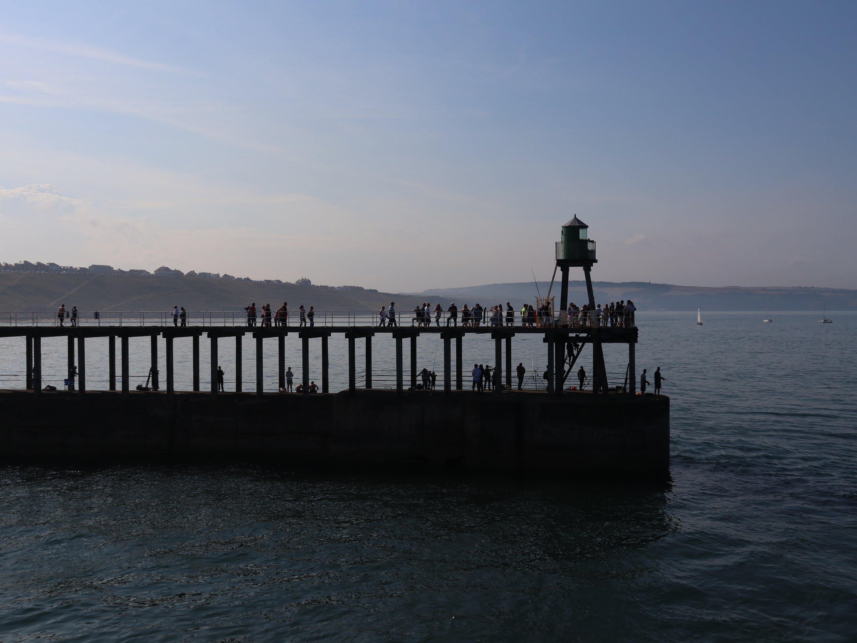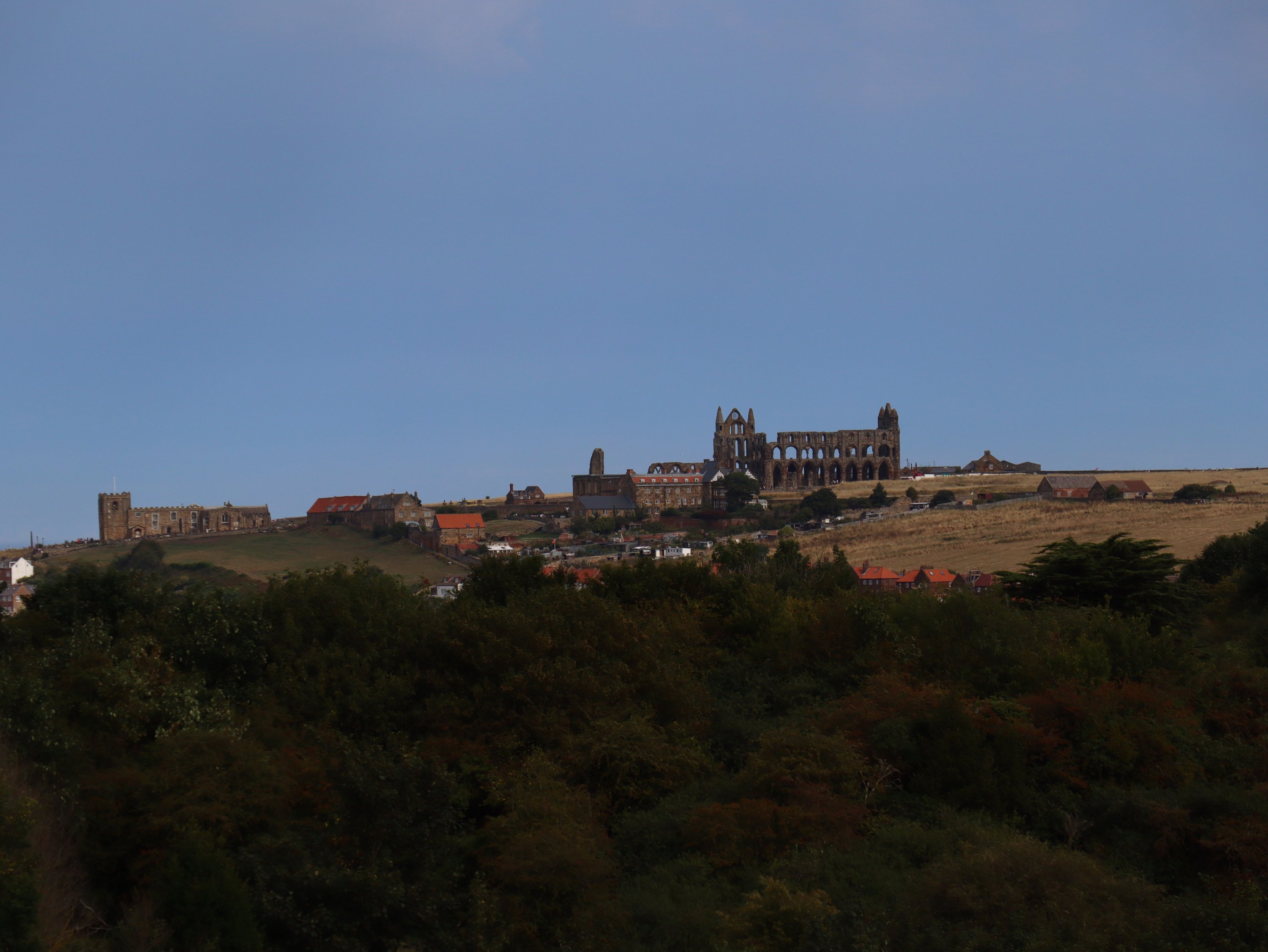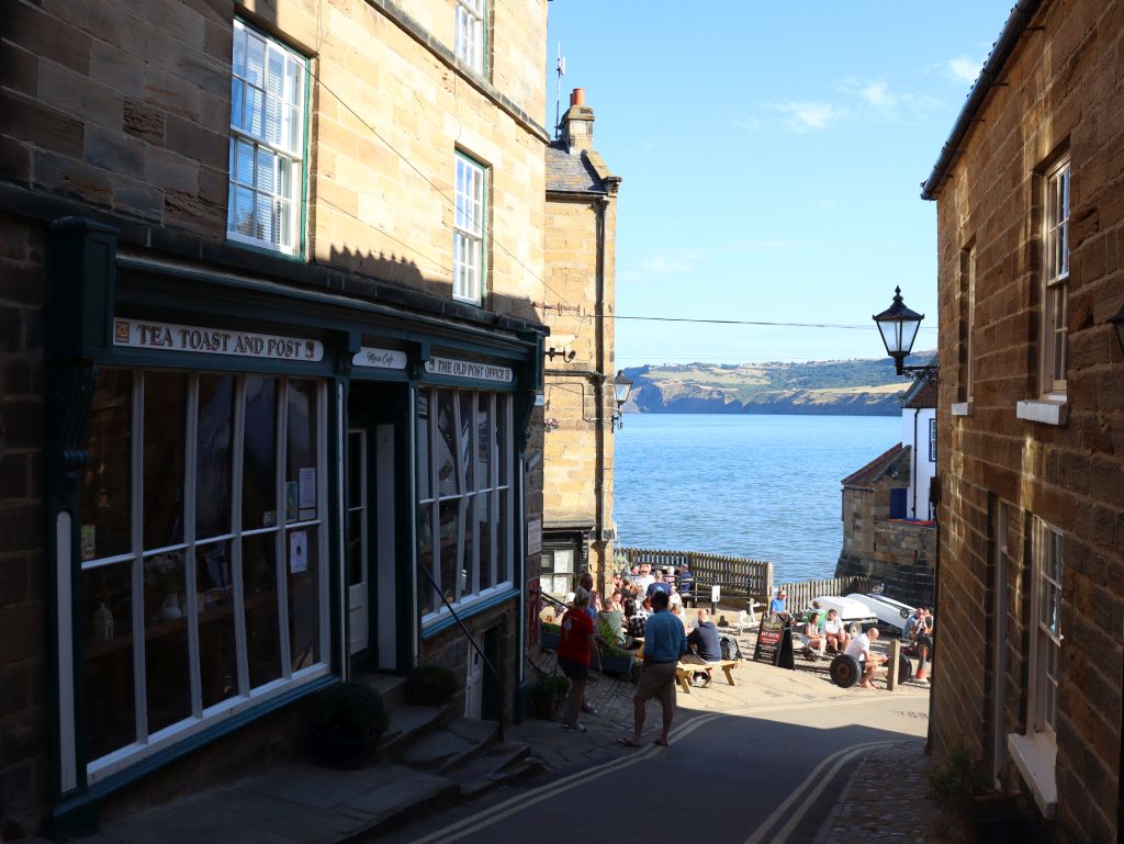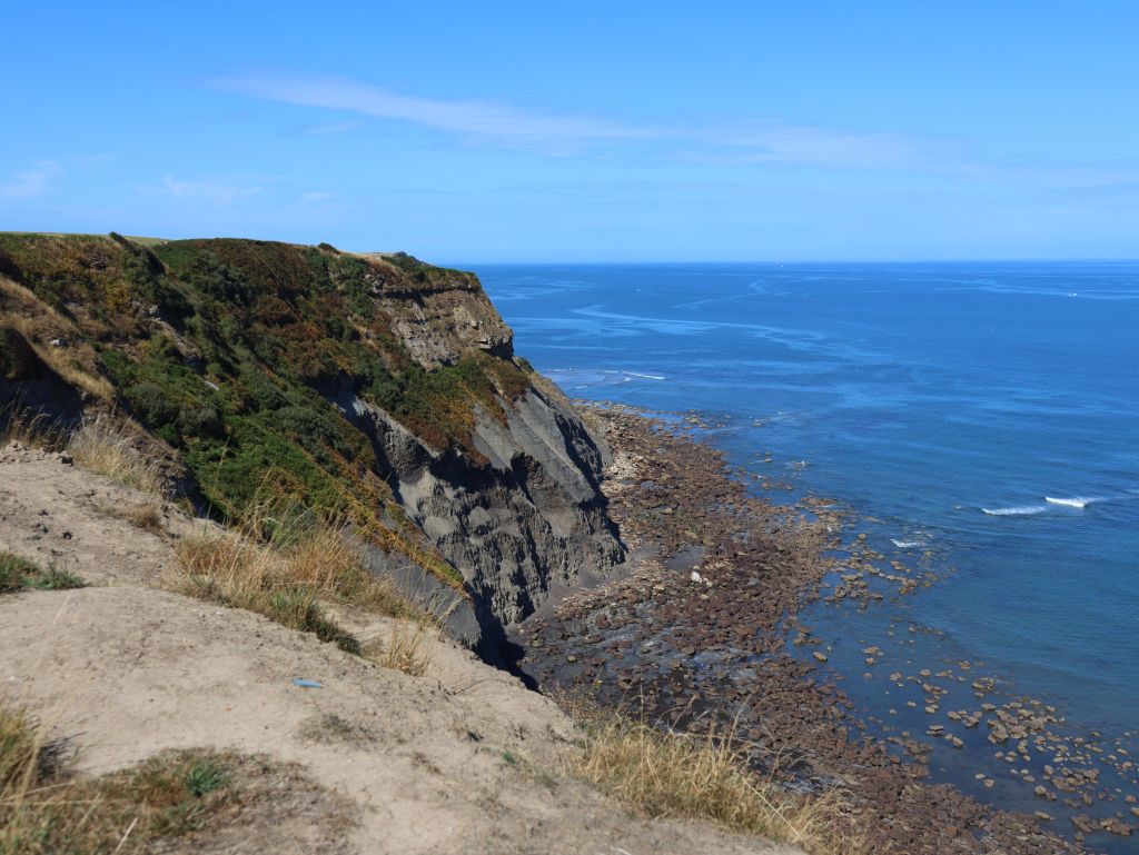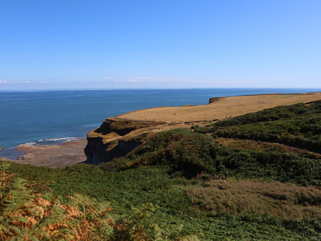 Spontan hatten wir gestern den Campingplatz für eine weitere Nacht gebucht. Bei dem tollen Wetter wollten wir die Küste und das Meer nicht so schnell wieder verlassen 😁. Das gibt uns die Möglichkeit heute nach Whitby über den Cinder Track – eine alte Bahnlinie – zu laufen. Hauptsächlich ist dieser als Radweg gedacht aber Fußgänger und Pferde sind herzlich willkommen ihn auch zu benutzen. Im Gegensatz zu dem Stück direkt an der Steilküste entlang ist der Cinder Track eine „Autobahn“ zum Wandern. In Rekordzeit sind wir die knapp 10 Kilometer in gut 2 Stunden bis Whitby gelaufen. Ab hier ging es deutlich langsamer vorwärts und wir waren nach der lange Zeit in der einsamen Natur mit den Menschenmassen in der Stadt dezent überfordert. Ja, wir wussten es wird voll, aber irgendwie ist das jetzt trotzdem sehr viel Zivilisation auf einmal! Bevor wir zur Whitby Abby aufsteigen, suchten wir uns ein nettes Lokal für Fish& Chips. Nachdem ich die ersten Portionen auf den Nachbartellern erspäht hatte, war ich froh, dass auf der Karte eine kleine Portion angeboten wurde. Ich hab zwar nach der Strecke Hunger, aber ich möchte auch noch den Berg raufkommen.