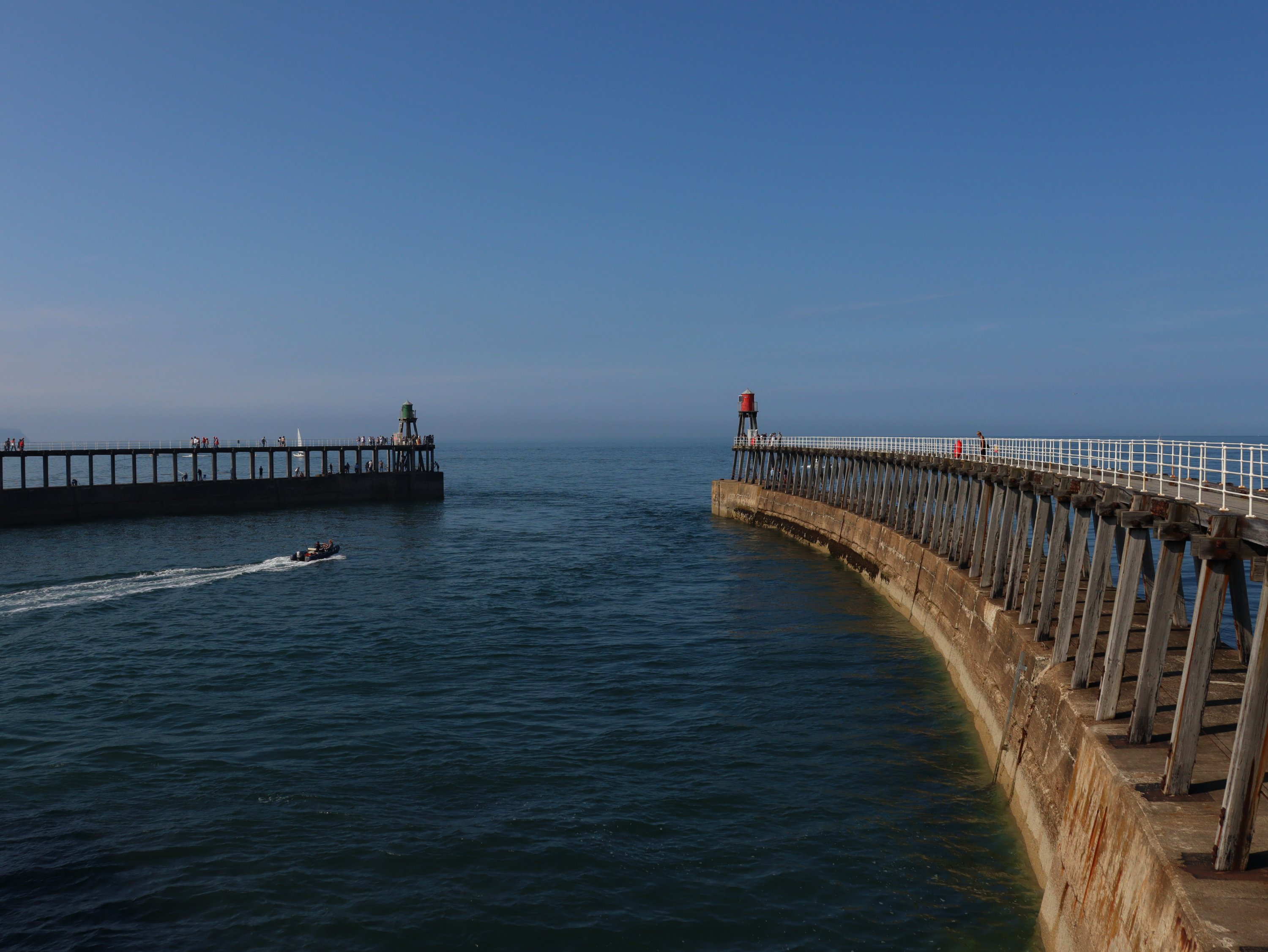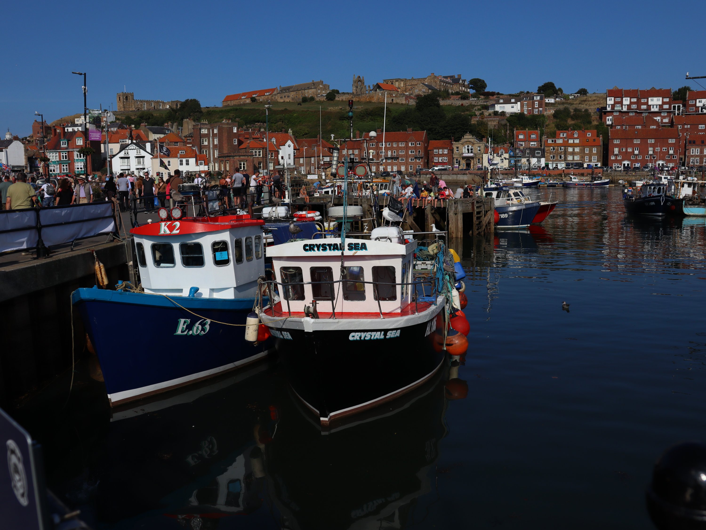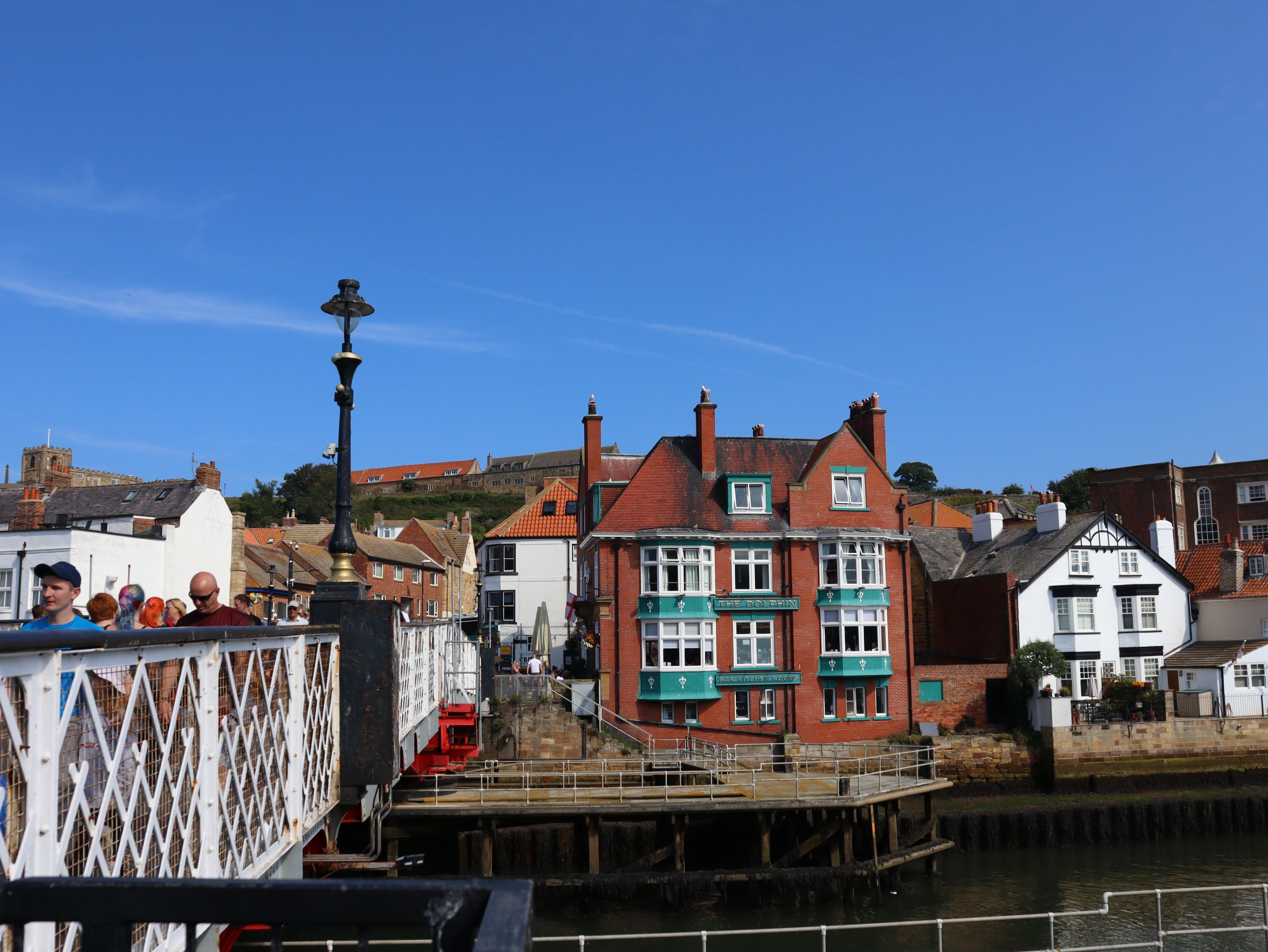 Spontan hatten wir gestern den Campingplatz für eine weitere Nacht gebucht. Bei dem tollen Wetter wollten wir die Küste und das Meer nicht so schnell wieder verlassen 😁. Das gibt uns die Möglichkeit heute nach Whitby über den Cinder Track – eine alte Bahnlinie – zu laufen. Hauptsächlich ist dieser als Radweg gedacht aber Fußgänger und Pferde sind herzlich willkommen ihn auch zu benutzen. Im Gegensatz zu dem Stück direkt an der Steilküste entlang ist der Cinder Track eine „Autobahn“ zum Wandern. In Rekordzeit sind wir die knapp 10 Kilometer in gut 2 Stunden bis Whitby gelaufen. Ab hier ging es deutlich langsamer vorwärts und wir waren nach der lange Zeit in der einsamen Natur mit den Menschenmassen in der Stadt dezent überfordert. Ja, wir wussten es wird voll, aber irgendwie ist das jetzt trotzdem sehr viel Zivilisation auf einmal! Bevor wir zur Whitby Abby aufsteigen, suchten wir uns ein nettes Lokal für Fish& Chips. Nachdem ich die ersten Portionen auf den Nachbartellern erspäht hatte, war ich froh, dass auf der Karte eine kleine Portion angeboten wurde. Ich hab zwar nach der Strecke Hunger, aber ich möchte auch noch den Berg raufkommen.