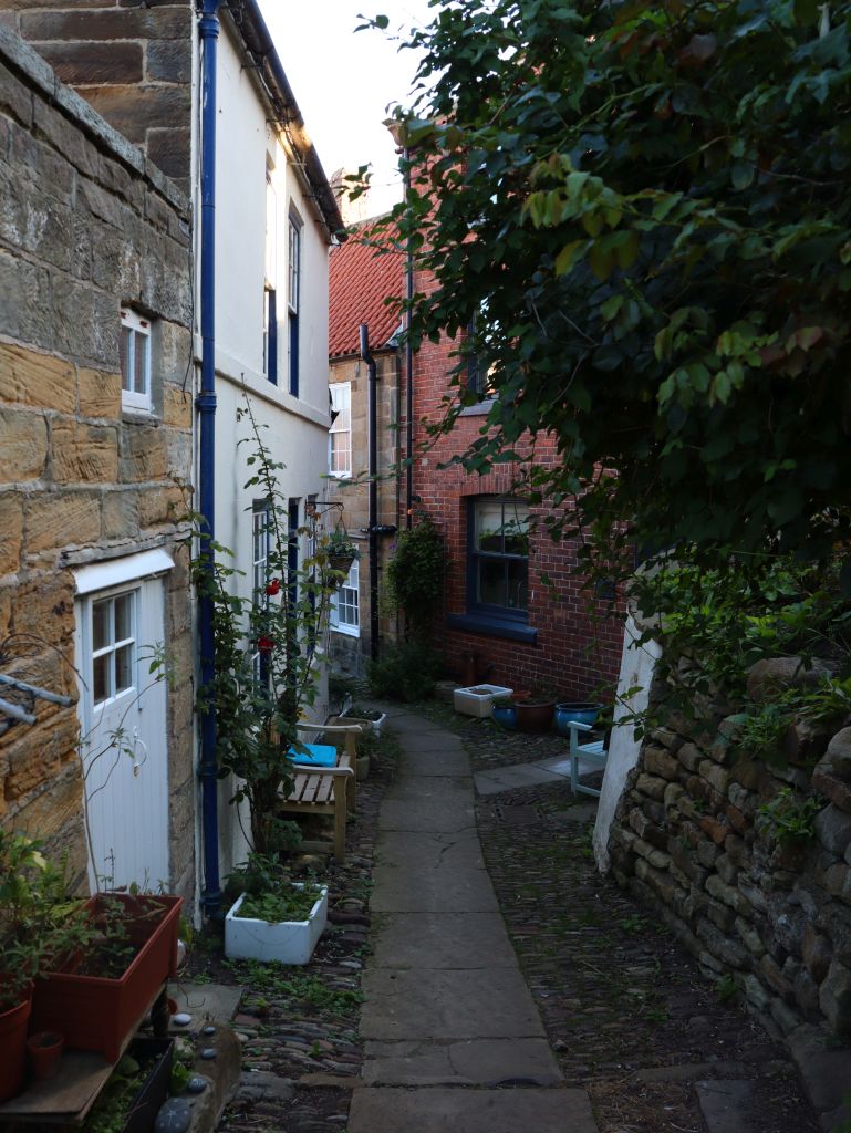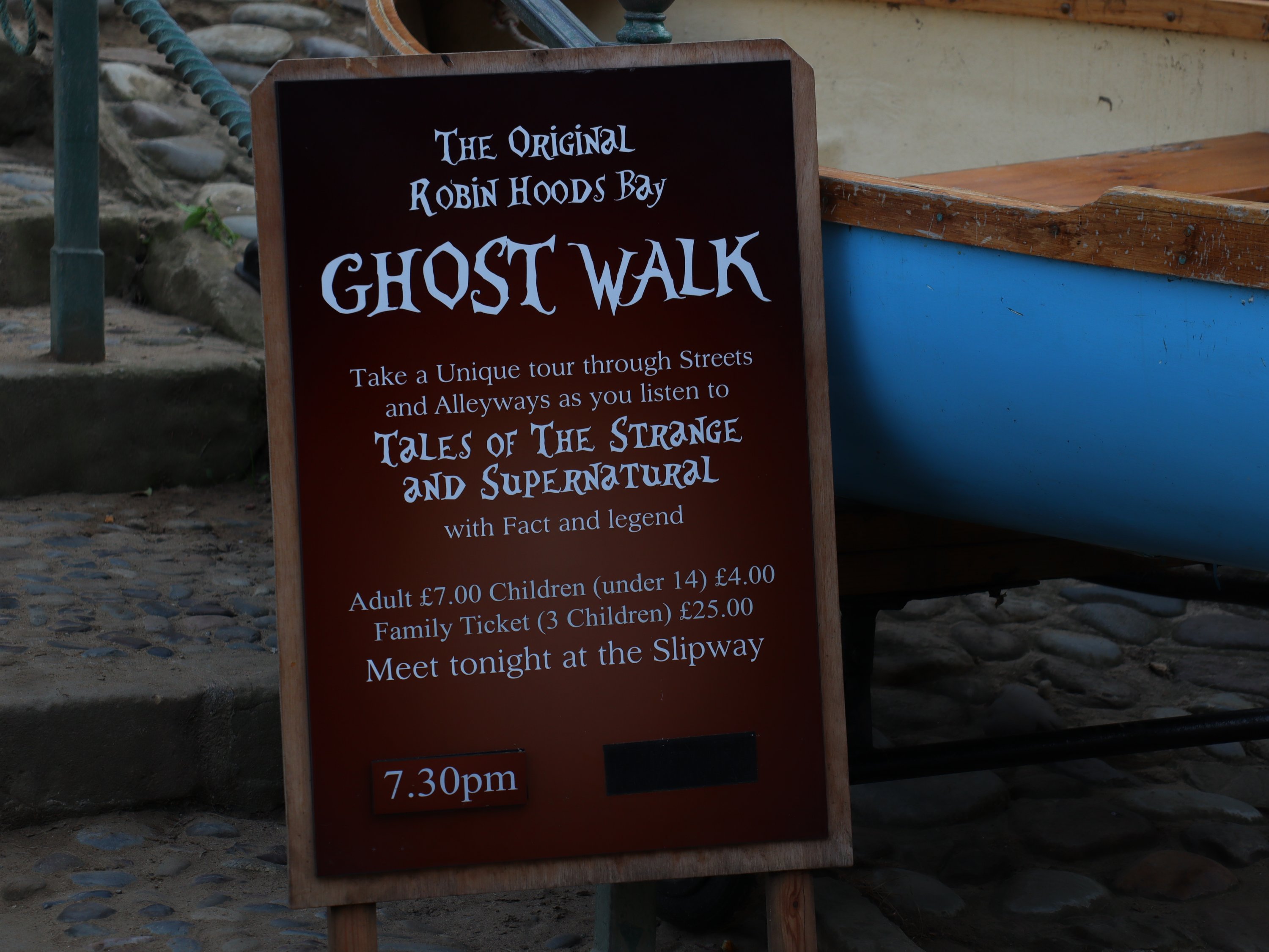 Die Tour beginnt am Slipway vor dem Bayhotel. Das heisst wir müssen gaaaaanz nach unten in den Ort. Dort angekommen dauerte es nicht lange bis eine komplett schwarz gekleidete Gestalt mit einer Gaslampe in der Hand die Straße entlang kam. Jep, eindeutig unser Guide heute Abend. Nach ein bisschen sortieren stellte sie sich als Rose vor, die hier in Robin Hoods Bay aufgewachsen ist und ALLE Geister-, Schmuggler – und Gruselgeschichten kennt, die es so gibt. Genau so gut gut wie die kleinen Gassen und Pfade durch die sie uns querbeet durch den Ort scheuchte. Die Dame war einfach Klasse und hat alles was rund um die Tour so passierte direkt mit eingebaut. Viel zu schnell waren wir am Ende der Tour angekommen, Steffi und ich hätten der guten Frau noch länger zu hören können. Ja, die Ghost Tour ist definitiv zu empfehlen! 👍