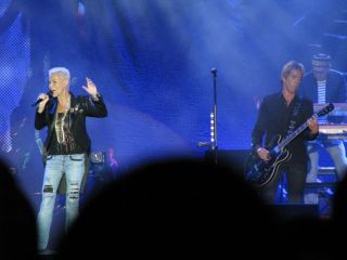 Nach einer laaaaangen Umbaupause ging es um kurz vor neun endlich mit Roxette los!!! Gleich mit den ersten Tönen von Dressed for Success war das Publikum mit von der Partie und machte ordentlich Party. War Marie in Halmstad noch eher zurückhaltend auf der Bühne unterwegs, umso mehr ist sie jetzt am Tanzen und fegt schon fast wieder wie in alten Zeiten über die Bühne. Nach Sleeping in my Car und The Big L. gab es das erste ruhigere Lied mit Wish I could fly … brr … wenn das gesamte Publikum mitsingt ist Gänsehaut schon vorprogrammiert. Ein großer Hit jagte den anderen, nur unterbrochen durch die Balladen, die Wort für Wort mitgesungen wurden! Der erste Teil des Konzerts wurde mit Joyride und einer Flut an bunten Luftballons beendet. Nach lauten Zugabe Rufen kam die Band zurück und es wurde Watercolours in the Rain, Spending my Time und The Look gespielt. Klar wurde das Publikum bei The Look ordentlich angefeuert immer lauter zu singen 😉 und es konnte richtig laut singen!!! Ob die Töne alle gestimmt haben steht auf einem anderen Blatt. :D. Zur zweiten Zugabe gab es dann endlich Way Out, die neue Single, in einer genialen Version zu hören! Mit Listen to your Heart und Church of your Heart ging ein absolut geniales Konzert (leider viel zu schnell) zu Ende. Als kleines Schmankerl wurde vom Veranstalter zum Abschluss noch ein Feuerwerk unter vielen aaahs und oohs gezündet. Müde aber glücklich machten wir uns, mit einem hartnäckigen Ohrwurm, auf den Rückweg. * sing* „Way out, out of the blue …“ 🙂