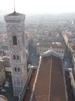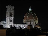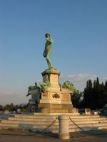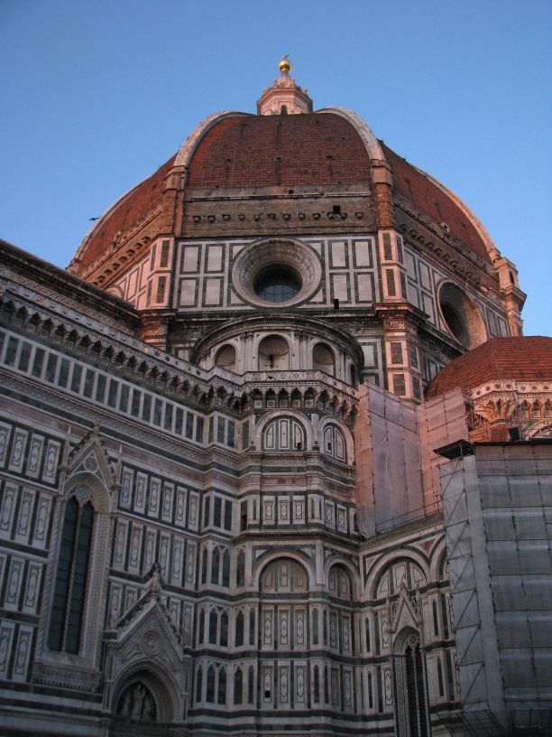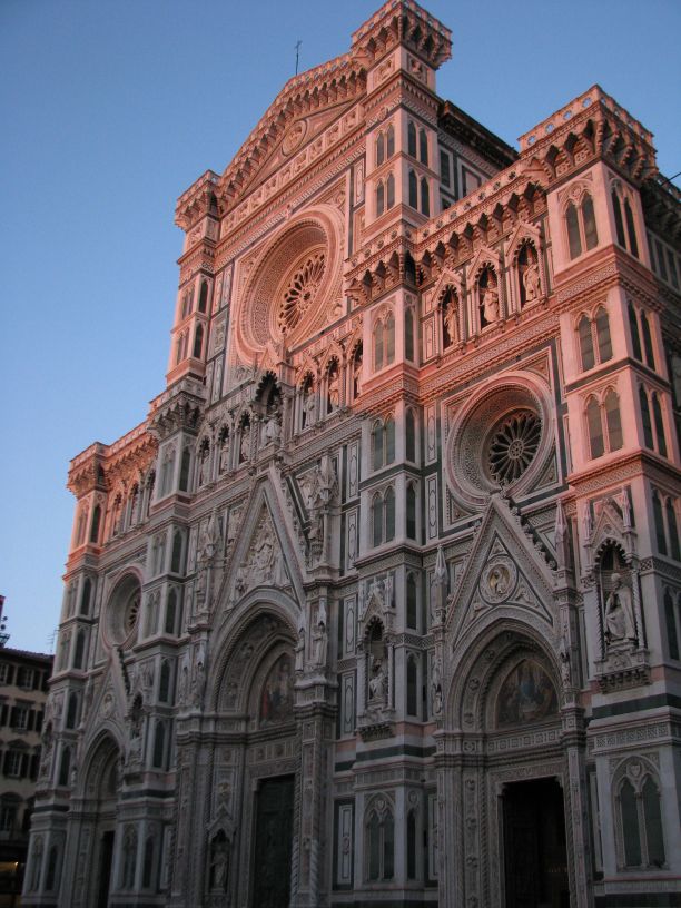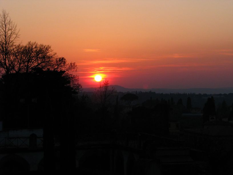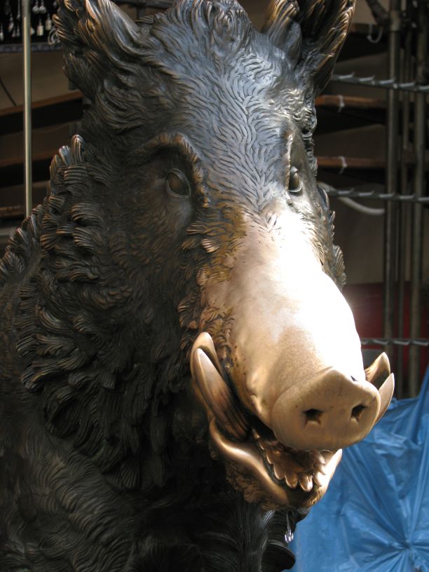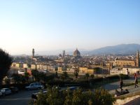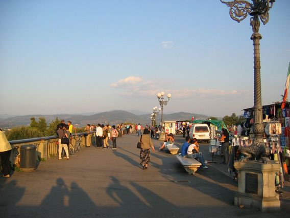 Nach dem kurzen Pit-Stop.. äh Badstop machten wir uns wieder auf die Socken mit Ziel Piazzale Michelangelo. Unterwegs machten wir noch einen Abstecher zum Kartenvorverkauf der Galeria degli Uffizi, um für den nächsten morgen die Karten zu holen, um der üblichen langen Warteschlange am Eingang zu entgehen. Nach etwas hin und her und geschacher um die Uhrzeit, wann wir dann unser Zeitfenster für den Einlass haben, packten wir unsere Tickets ein und spazierten gemütlich weiter zur Ponte Vecchio. Vorbei an den ganzen kleinen Schmuckläden über die Ponte Vecchio, weiter ein Stückchen am Arno entlang lag dann nur noch der „Aufstieg“ vor uns zum Piazzale. Was soll ich sagen die Aussicht (auf das erste Eis) zog uns recht fix den „Berg“ rauf ;). Oben angekommen bewunderten wir, zum verschnaufen, erstmal den Ausblick über die ganze Stadt und klar auf den Duomo, der groß und wuchtig mittendrin gar nicht zu übersehen ist. Noch waren wir nicht am höchsten Punkt angelangt, der ist auf dieser Seite San Minoato al Monte, aber erst war das versprochene Eis an der Reihe das schnell verputzt war. Die Finalen Treppenstufen überstanden, hatten wir die Basilika San Miniato erreicht und zusätzlich nochmal einen tollen Blick über die Stadt. In der Basilika schauten wir uns auf leisen Sohlen um, denn wir erwischten ausgerechnet bei unserem Besuch den Beginn der Hl. Messe. Wieder draußen beobachteten wir den Sonnenuntergang bis uns der Hunger daran erinnerte das wir uns langsam auf den Weg machen sollten. Auf dem Piazzale Santo Spirito wollten wir eigentlich zu einer Bar um dort zu essen die war leider noch geschlossen, auf dem Weg dorthin hatten wir eine Pizzeria gesehen die uns allen vier gefallen hatte, mh… verdammt, dort standen wir auch vor verschlossener Tür, aber ein kurzer Blick auf die Öffnungszeiten und die Uhr verrieten uns: die machen in zwei, drei Minuten auf, ja gut dann warten wir eben, verhungern tun wir soooo schnell dann auch nicht. Die Pizzeria entpuppte sich dann als Italienische Schnellrestaurantvariante mit Einweggeschirr, das tat der Pizza keinen Abbruch, die war trotz allem richtig lecker und der Wein auch erstaunlich gut. Satt und müde bewegten wir uns langsam zurück zum Hotel und fielen relativ früh todmüde ins Bett. Es war ein langer Tag und am nächsten Morgen ist auch nochmal zeitig aufstehen angesagt, da wir ein frühes Ticket für die Galeria degli Uffizi bekommen haben. Oh, das hatte ich ja noch fast vergessen ganz nach alter Tradition haben wir noch auf dem Rückweg am Strohmarkt dem Wildschweinchen, il Porcellino, über die feuchte Schnauze gestreichelt, für viel Glück und das man zurückkehrt nach Florenz!