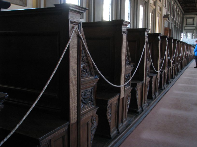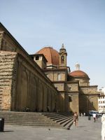 Gut gestärkt schlenderten wir vorbei an den ersten Marktständen um die Ecke, zu San Lorenzo. Diese sollte die erste von vielen, vielen Kirchen sein die auf unserem Touriprogramm stand. Mit einem Kombiticket besuchten wir zuerst die Biblioteca Medicea Laurenziana, da wir hier nur noch eine halbe Stunde Zeit hatten ehe sie geschlossen wurde. Das besondere an der Bibliothek ist, das der Eingangsbereich also die Treppe mit dem drumherum, die Lesepulte und die Decke von Michelangelo entworfen wurden. Nach diversen erfolglosen Versuchen meinerseits, ich stand immer vor verschlossener Tür, war das nun mein erster Besuch in der Bibliothek und als Bonus gab es dort noch eine mittelalterliche Medizinausstellung zu sehen. Schon ein bisschen gruselig teilweise. Nach einem Kurzbesuch in der Crypta, ging es zurück zur unscheinbaren Front von San Lorenzo und in die Kirche rein. Das innere der Kirche steht im krassen Gegensatz zur unfertigen Fassade, da sie reichlich geschmückt ist und viele Gemälde in den einzelnen Kapellen der Seitenschiffe zu bewundern sind.