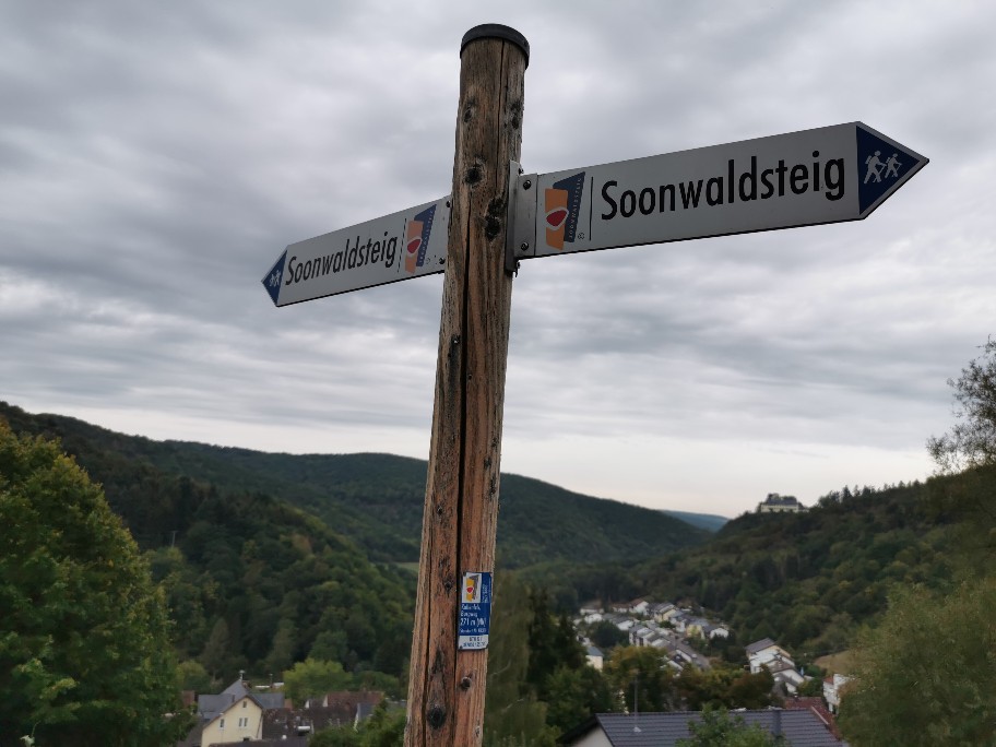 Beim Ausblick auf die erste Burg trafen wir auf ein ein junges Paar. Schnell kamen wir ins Gespräch, deuteten doch die großen Rucksäcke auf Langstrecken Wanderer. Wir lagen richtig, die beiden waren wie wir auf dem Soonwaldsteig unterwegs und sind von Trekkingcamp zu Trekkingcamp gelaufen, mit voller Ausrüstung. Sie haben aber verraten, dass sie vorher zwei Wochen in den Bergen gelaufen sind und entsprechend fit waren. Es war lustig zu hören, dass wir sehr ähnliche Erfahrungen unterwegs gemacht haben.