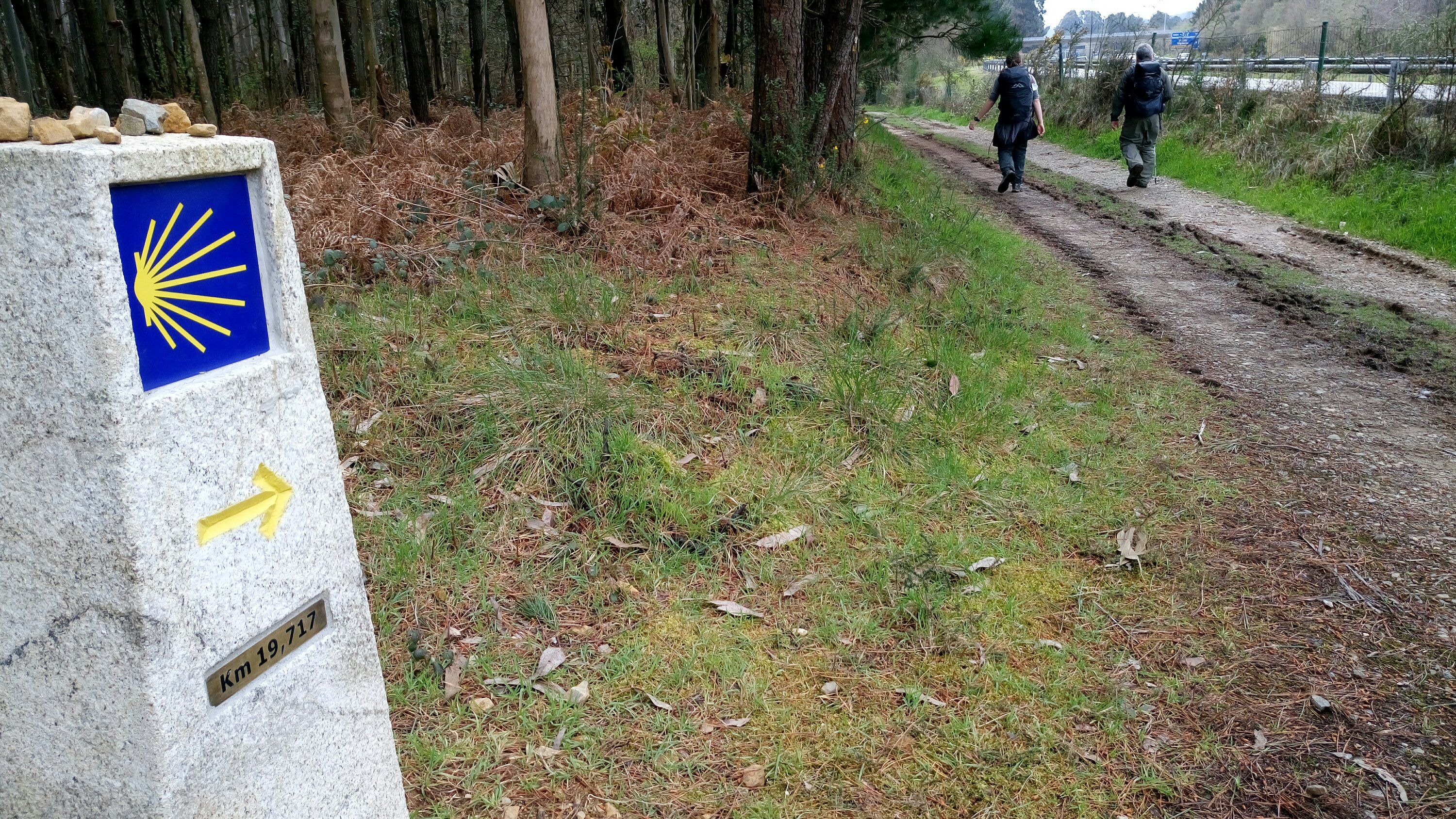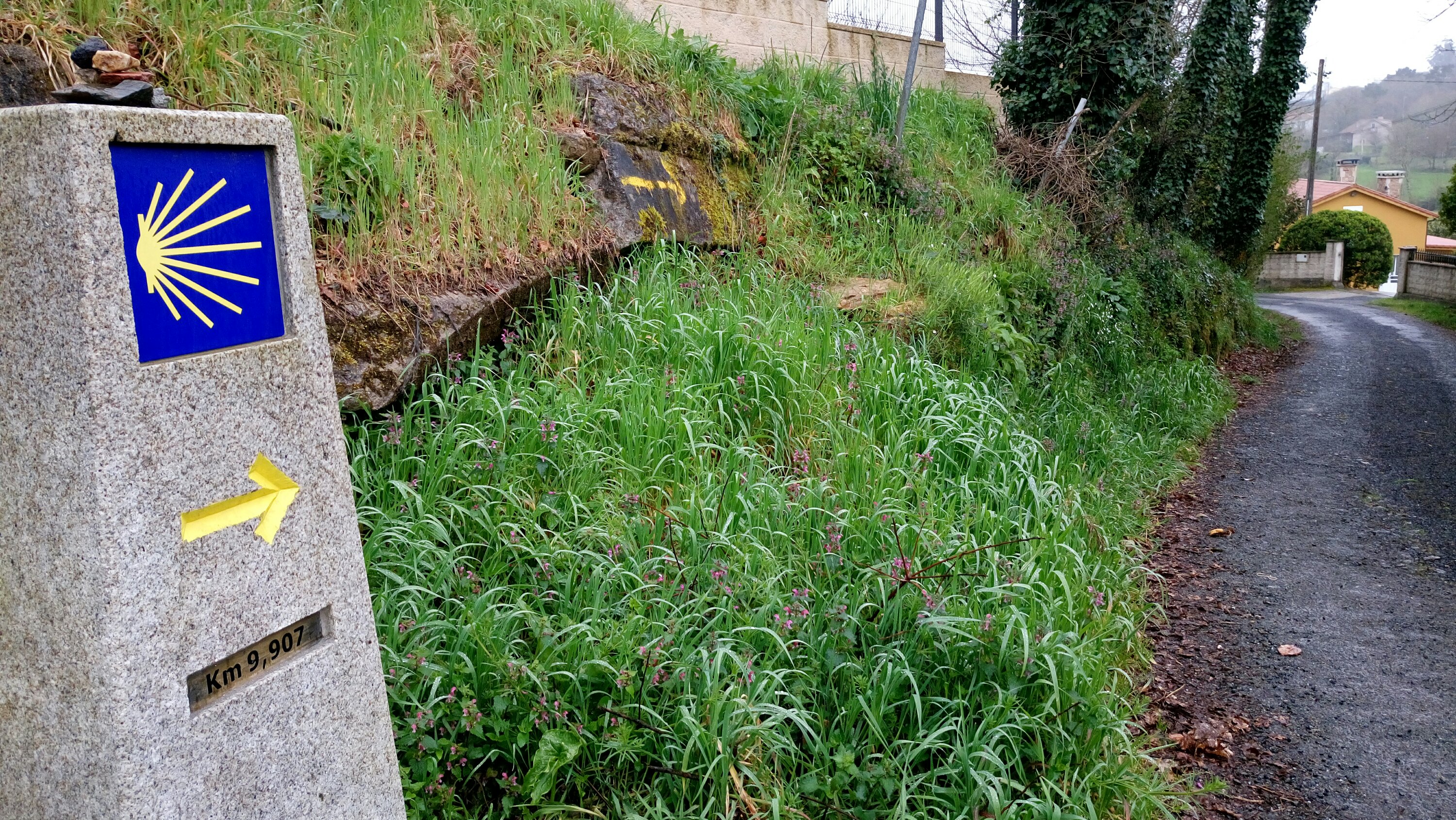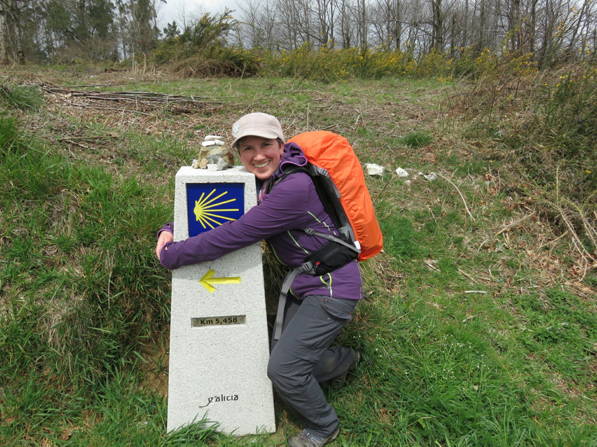 Die Kilometerzahlen auf den Wegmarkierungen wurden schnell einstellig und ich sah endlich meine Chance den fünf Kilometer Stein zu umarmen. Den gibt es ja leider nicht mehr auf dem Camino Frances. Beim fünf Kilometer Stein hatte sich der Regen auch wieder mal verzogen und so war das Foto kein Problem, yeah!